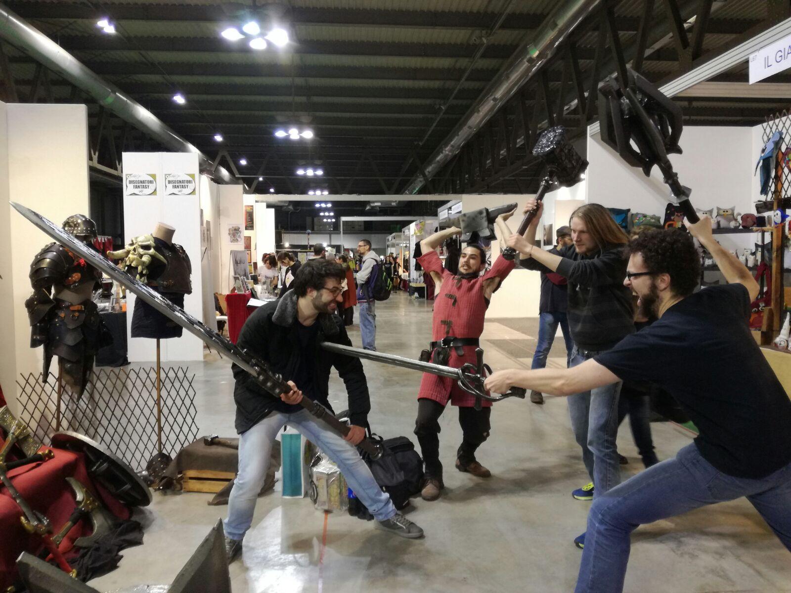 Pubblicato 11 Marzo 20178 anni comment_1319660 Ciao a tutti! Approfitto del forum per far conoscere agli utenti l'attività di un simpaticissimo ragazzo che ho conosciuto al Cartoomics di Milano di quest'anno. Si tratta di Michele Ruggiu, un "fabbro" che realizza armi, scudi, armature e oggettistica varia in lattice, principalmente per gdr dal vivo o cosplay. Ho avuto modo di constatare la qualità del suo lavoro, che mi è sembrata molto buona. Le armi sono piacevoli da maneggiare e hanno un design decisamente accattivante. Michele è stato molto disponibile a scambiare due chiacchiere, farci provare i suoi prodotti e a farci anche fare alcune foto. Ne riporto qua sotto una, per farvi vedere il suo operato: In foto potete vedere il sottoscritto con un tradizionale abbinamento stocco+mazza pesante, il temibile @Pich23 con spadone a due mani, un amico comune con il maglio e Michele Ruggiu con un'arma improvvisata (mancherà infatti il bersaglio a causa della penalità al TxC). Se qualcuno fosse interessato, riporto alcuni suoi contatti: Michele Ruggiu via Ugo Foscolo 11 25020 Flero (BS) info@tierlab.com 0307689082http://tierlab.com/ Modificato 11 Marzo 20178 anni da ilmena