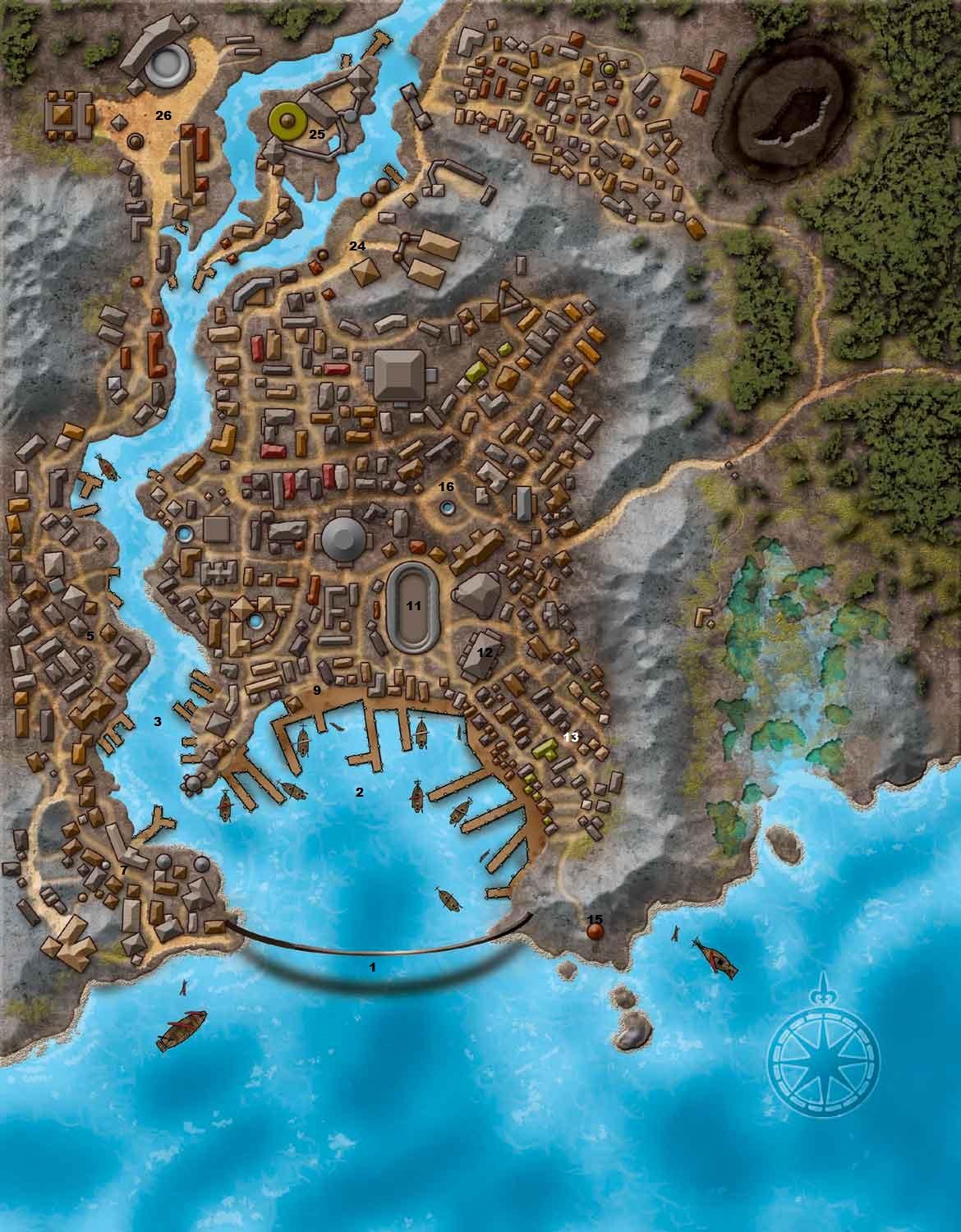 5 Luglio 20178 anni Autore comment_1363018 1° Giorno di Arodus, 4708 AR. (Circa 01.00 di notte). Decidete di lasciare la Forca. Una volta usciti cercate un luogo appartato in cui poter parlare liberamente; cosa che non vi riesci difficile visto quasi più nessuno si aggira per le strade di Rotgut. Dwayne vi spiega l'incontro avuto con il membro dello Sacra Famiglia, soffermandosi sul compito che dovrete svolgere. @Riddleport Map Spoiler Legenda: 1. Il Glifoportale. 2. Il Porto di Riddleport. Il porto di RIddleport è cresciuto naturalmente durante gli anni grazie all’affluenza delle navi. Le acqua del porto fanno da sbocco per alcuni dei canali fognari della città e al fiume Velashu, trasformando, di tanto in tanto, l’acqua in un insalubre color marrone. Nonostante ciò, nella maggior parte del tempo le acque rimangono limpide e popolate da numerose specie di pesci che, a loro volta, hanno contribuito all’affluenza nel porto di grandi predatori. Un marinaio che cade in acqua ha solitamente pochi minuti per tornare all’asciutto prima che diventi la cena per qualche squalo. 3. Il Porto Interno. Un porto più piccolo situato alla bocca del Fiume. L’elevato inquinamento dell’acqua la rende totalmente non potabile. Proprio grazie a quest’inquinamento, però, le acque possono considerarsi meno infestate dai predatori. 5. Il Distretto Idrico. Il Distretto Idrico corre su entrambi i lati del fiume Velashu. Qui si trovano i maggiori commerci di quei pochi prodotti realizzati a Riddelport, ovvero metalli lavorati, legnami, stoffa, pelli conciate e pesce. Gli scarichi di queste lavorazioni vengono spesso buttati nel fiume o nella strada, causando il pungente odore per cui questo quartiere è noto. 7. Distretto Sopravento. Il distretto di Sopravento rappresenta una delle parti della città con più affluenza. Gli edifici sono costruiti in pietra e solido legno sulle pendici della parte occidentale della città. Qui risiedono la maggior parte dei saggi e studiosi della città. Il suo nome è dovuto alla calda brezza estiva che soffia incessantemente durante il periodo estivo. 9. Distretto del Molo. Questo distretto sorge immediatamente vicino le banchine del molo, ed è proprio qui che svolge la maggior parte del commercio portuale e degli atti di criminalità. Vicino al molo si possono trovare alcuni negozio e bettole in cui comprare del grog a poco prezzo, la maggior parte infestati da pirati e altri criminali. Una volta il distretto rappresentava il centro del commercio in città, ma, ora che Free-Coin ha preso il suo posto, rimane solamente l’ombra di quello che era un tempo. 11. Arena di Zincher. Quest’imponente struttura di pietra domina il distretto del Molo. Nell’arena vengono organizzati brutali combattimenti fra schiavi, prigionieri, pirati, mostri e altre creature, offrendo un intrattenimento unico agli abitanti della città. 12. Le Fucine a Gas. Queste particolari forge sono situate sopra un deposito di carbauxina, un gas molto pericoloso ma unico nel suo genere in quanto permette la lavorazione di particolari metalli. Le forge sono interamente gestite da nani. 13. Il Distretto di Rotgut. Il distretto di Rotgut è sicuramente il più povero di Riddleport. In queste zone si registra il più alto tasso di criminalità. 15. Il Faro di Riddleport. 16. Il Distretto di Leeward. Leeward è sicuramente il distretto più grande di RIddleport e la sua posizione gli permette di essere protetto dai freddi venti invernali. Solitamente gli edifici sono a più piani, dove al piano terra si trova il negozio e ai piani superiori le abitazioni. Mercati e templi sono molto popolari in questa zona e virtualmente si può trovare di tutto. 24. La Forca del Diavolo. E’ qui che si trova il distretto militare dei Gendarmi di Riddleport. La posizione permette di proteggere sia il nord che l’est della città. Oltre alla caserma per i Gendarmi, qui si trova il duro carcere di Shoreleave. 25. L’Isola di Maskyr. L’isola prende il nome di Cambriem Maskyr, il primo Signore della Guerra di Riddleport. Quest’isola rappresenta una cittadella a parte dove le figure più ricchi e importanti della città, fra cui Gaston Cromarcky, risiedono. In questa parte della città sono anche situati gli edifici riguardanti l’amministrazione cittadina. Il molo, le strade e tutti gli edifici sono controllati costantemente dai Gendarmi. 26. Il Distretto di Free-Coin. Da alcuni anni le sale da gioco di Riddleport hanno visto un aumento in popolarità, ricchezza e afflusso di denaro. Il distretto è diventato un’importante meta turistica per i visitatori e anche per i cittadini di Riddleport. Modificato 5 Luglio 20178 anni da KingKunta Segnala