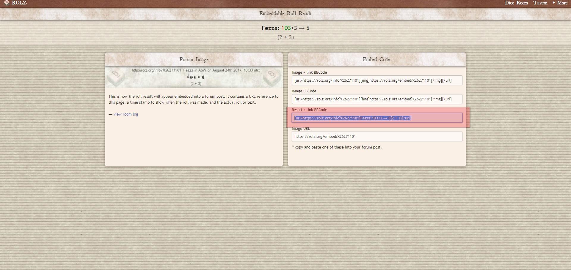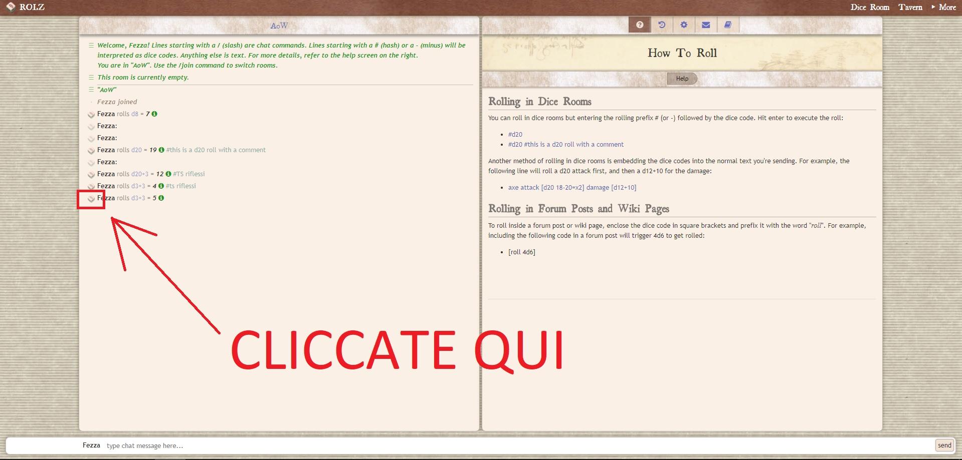 24 Agosto 20178 anni Autore comment_1377456 Ne ho trovato un altro, più bellino, semplice.. anche con l'embedding per i forum. Il sito è questo ROLLER ONLINE e basta registrarsi e joinare la dice room. L'ho chiamata per semplicità "AoW". Ci sono tutti i log di chi entra e chi esce, mi pare fatta molto bene e semplice da utilizzare Nella prima immagine ho digitato nella barra sotto questo codice di esempio: "#d3+3 #TS riflessi" dove dopo il primo hashtag si mette il dado e bonus che si vuole rollare, e dopo il secondo hashtag si mette la descrizione di ciò che si è appena rollato Sempre nella prima immagine, ho poi cliccato dove vi ho scritto "CLICCATE QUI" e mi si è aperta l'altra schermata (immagine 2) Nella seconda immagine vi verrà fuori il risultato del tiro nella finestra di sinistra, mentre in quella di destra avrete i codici incorporabili nei forum. Basta copiare ed incollare per mostrare il risultato del tiro. Qui sotto vi metto come verrebbe visualizzato il tutto se copiate ed incollate quello che vi ho detto @ESEMPIO DI TIRO Spoiler Fezza:1D3+3 → 5(2 + 3) VI piace? Segnala