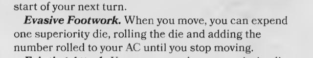 16 Aprile 20196 anni Supermoderatore comment_1585155 3 minuti fa, sabatecus ha scritto: 3- nel mio turno muovo attivando la manovra e ho il bonus SOLO per quella singola azione di movimento, quindi il bonus si applica solo ad eventuali attacchi di opportunità Questa è la risposta coretta come confermato da Crawford su Sageadvice Evasive Footwork grants its AC bonus only during your current movement Quindi sì essenzialmente è un modo per provare ad evitare degli AdO senza dover spendere l'azione di Disimpegno. Per essere pignoli comunque non esiste "l'azione di movimento" esiste il movimento, che è cosa separata ed aggiuntiva rispetto all'Azione (e all'azione bonus) ed esiste l'azione di Scatto che permette di raddoppiare di quanto ci si muove in un turno con il movimento. Segnala