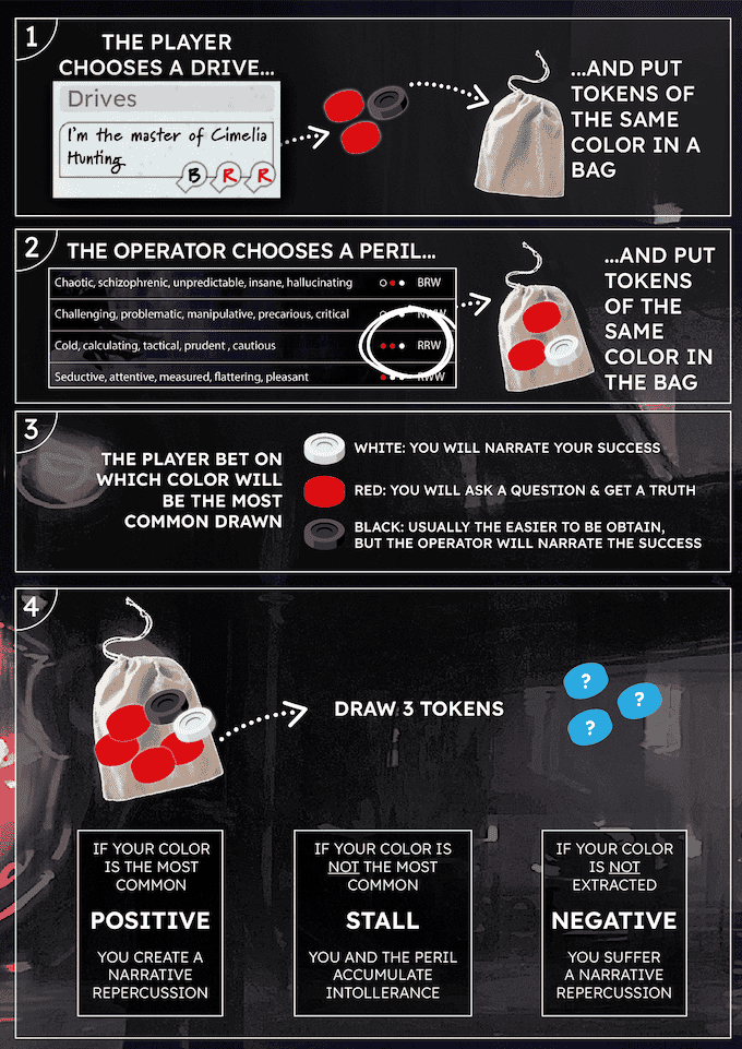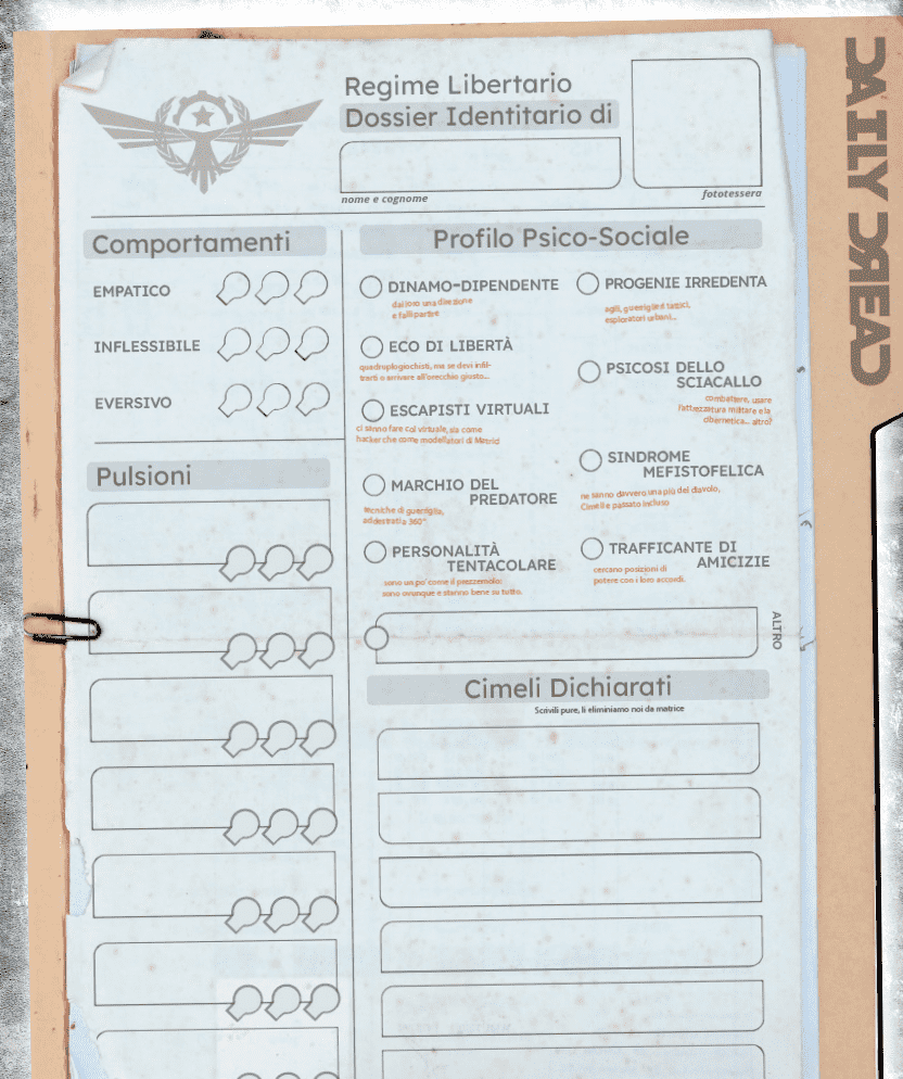 9 Settembre 20223 anni comment_1817601 Su Kickstarter è disponibile Daily Dread - Il Male Quotidiano, un gioco di ruolo ambientato in un'Italia futuristica che cerca di sopravvivere alle Riforme di un Regime che punta a raggiungere un'utopica autarchia. Scadenza 21 Settembre 2022 Il 30 Agosto 2022 è approdato su Kickstarter un nuovo gioco di ruolo bilingue (italiano / inglese), dal tema cyber-distopico pre-apocalittico: Daily Dread - Il Male Quotidiano. Creato da Zeus Longhi, autore del setting e co-autore delle regole, e Daniele Fusetto, autore delle regole e direttore artistico del progetto, il team di Grumpy Bear (Blades in the Dark, Non Cedere al Sonno, AGON) vestirà il ruolo di partner editoriali. Partito con un obiettivo di appena 1.300 €, in pochissimo tempo la campagna ha raccolto più del doppio della cifra prevista. Questo eccesso ha permesso di incrementare il numero di scenari inediti, scritti da Game Disegner e note personalità del mondo dei GdR, che andranno ad aggiungersi alle appendici e regole aggiuntive già contenute nello Stretch Book, un manuale supplementare che affiancherà il Core Book (libro brossurato A5 a colori) nei Pledges associati ai vari livelli. Design (non definitivo) del Manuale Ambientato in una distopica Italia del futuro piegata dall'oppressione di un Regime Libertario, Daily Dread incrocia atmosfere alla “1984” con quelle mediterranee, facendo vivere ai giocatori le sensazioni della quotidianità di un mondo che si rivela distopico e alienante. I confini statali sono chiusi da decenni e nulla trapela all’estero grazie ad un controllo dei media e del web; intanto il Regime si insinua nelle vite dei cittadini, che dovranno decidere se difendersi o piegarsi a continui piccoli atti di aggressione psicologica. Pochi gruppi di Ribelli agiscono senza preoccuparsi delle conseguenze, mentre il Regime ha messo in atto un programma di Riforme per raggiungere l’autarchia, armando e tramutando Militanti in veri e propri Esecutori. Il giocatore è chiamato ad interpretare una delle Ali Spezzate: comuni cittadini che né si piegano al regime, né appoggiano le azioni dei Ribelli. Dovrai trovare un modo per sopravvivere: sacrificherai tutto e ti nasconderai tra le piaghe del Regime, o soffrirai tentando di fermarlo? Scheda di Gioco I personaggi possiedono due tipi di tratti: tre comportamenti (Empatico, Inflessibile ed Evasivo) che definiscono il modo in cui il personaggio agisce, e cinque pulsioni (rappresentate da frasi che individuano Bisogni, Ossessioni e Propositi). I tratti sono a loro volta definiti da 3 indicatori (o spie) che possono cambiare colore per indicare quanto questo è più vicino all'umanità o alla disumanità (bianco per il controllo, rosso per l'incertezza e nero per l'instabilità). Quando un personaggio vuole resistere a una situazione, sosterrà un test di Rorschach. Il giocatore descriverà l'azione e metterà in un sacchetto opaco un numero di gettoni colorati pari alle spie della propria Pulsione. L'Operatore (il "master" del gioco), inserirà gettoni pari alle spie della Pulsione del nemico o a quelle del Pericolo affrontato. Il giocatore sceglierà un colore, quindi l'Operatore estrarrà tre gettoni: se il colore scelto è il più comune tra i gettoni estratti, il Test è superato. Altrimenti potrebbe essere uno stallo (il colore è tra i gettoni estratti, ma non il più comune) o un fallimento (il colore non è stato estratto). A seconda dell'estrazione e della Pulsione utilizzata, giocatori e master descriveranno l'esito dell'azione. Riassunto delle Meccaniche di Gioco Le ricompense sono divise in sei livelli e di seguito li elenchiamo velocemente: Simpatizzante: con un contributo di 1€ o più, oltre ai ringraziamenti del team si ottiene l'accesso agli update del progetto. Cittadino: con un contributo di 9€ o più o di 13€ o più, oltre ai ringraziamenti e all'accesso agli update del progetto si portano a casa il Core Book e lo Stretch Book in formato PDF. Ala Spezzata: con un contributo di 18€ o più, oltre alle ricompense precedenti si ottiene anche il Core Book in formato fisico. Gufo Notturno: con un contributo di 28€ o più, oltre alle ricompense precedenti si ottiene anche lo Stretch Book in formato fisico. Prima Ala: con un contributo di 36€ o più, oltre alle ricompense precedenti si ottiene anche un sacchetto di spie (1 sacchetto + 18 tokens). Operatore: con un contributo di 165€ o più, oltre alle ricompense precedenti si ottiene anche una Macchina di Rorschach, fisica, realizzata con custodia stampata in 3D e funzionante grazie ad una macchina Arduino alimentata da una batteria da 9 Volt (non inclusa). Link al Kickstarter: https://www.kickstarter.com/projects/grumpybearstuff/daily-dread-a-cyber-dystopian-ttrpg-zinequest?ref=card Visualizza articolo completo Segnala