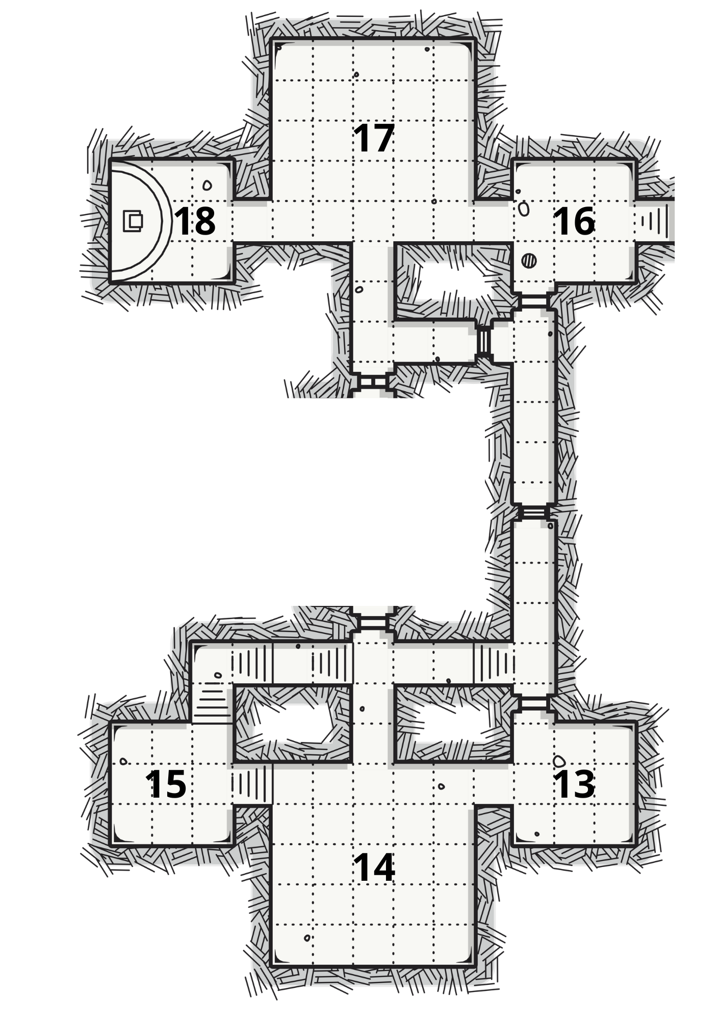 Una stanza (16) simile a quella dove siete arrivati dal buco nel pavimento (13). Da qui una scala e un corridoio porta nuovamente all'esterno: è uno degli ingressi minori che avete visto sulla facciata. L'altro, quello crollato, probabilmente riportava alla stanza con il buco.