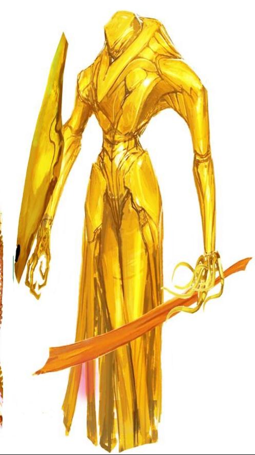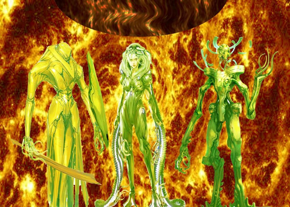 Le Tre Figure Quarid vengon distratte dalla "Conferenza Virtuale" da alcuni Olo-Glifi a Cascata che scorrono dalla immensa Piramide Dorata che li sovrasta, rappresentante l'Inconscio Collettivo Digitalizzato della Razza di Biomacchine Tecnorganiche Senzienti. . .