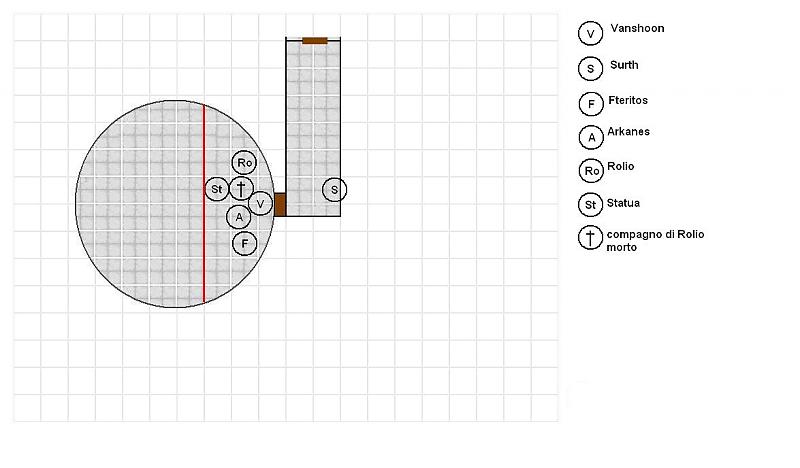 14 Marzo 200817 anni Autore comment_206693 @ Vanshoon, Surth, Arkanes e Fteritos La statua si muove, attivandosi del tutto, mentre agite al meglio. Il vostro sangue si gela per un attimo, mentre con qualche passo attraversa, come se di niente fosse, il Muro di Forza di Fteritos. Come se non esistesse. Il muro, dietro di lei, ormai, è ancora intatto. Il più vicino alla statua è il compare di Rolio, che timidamente tira fuori la sua spada, ma un mulinello di braccia e armi lo affetta, malgrado il suo tentativo di difesa. Fiotti di sangue si spargono ovunque, bagnando sia Arkanes che Rolio, vicini al povero brigante, che cade al suolo. Almeno quel che ne rimane. Braccia ed arti sono state tranciate di netto, e la scimitarra della statua è l’ultima ad uscire del petto dell’uomo, lasciandolo quindi cadere inanime. @ Vanshoon Spoiler: Situazione critica. Non ci vuole un genio per capire che non ci sarà tempo di individuare con calma le trappole. @ Surth Spoiler: Il corridoio prosegue. Ma un'altra porta blocca la strada più avanti. Questa porta però non ha rune, e sembra una normale porta di legno bardata di metallo, con tanto di serratura e maniglia. @ Arkanes Spoiler: Non noti aure particolari di magia nel pezzo di corridoio in vista. @ tutti Spoiler: Mappa di combattimento in allegato (imageshack mi da problemi) Iniziative: Vanshoon: 18 Surth: 11 Arkanes: 9 Fteritos: 16 Rolio: 15 Statua: 12 Segnala