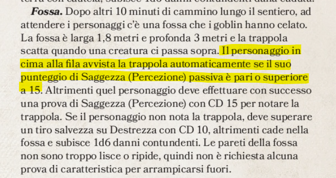 16 Settembre16 Set comment_1926419 7 ore fa, nolavocals ha scritto:Espresso male, ti riporto la parte dell'avventura dove utilizza la percezione passiva sempre come fonte "attiva":UN PG tira solo se il suo punteggio passivo non basta.Pensa che la leggo in modo diverso:Per notare la trappola (finalità: ogni volta che si ha questo scopo)deve tirarequando il suo punteggio passivo non basta (limitazione: limitatamente ai casi in cui non la nota in automatico)E nonquando il suo punteggio passivo non basta (causa: poiché non la nota in automatico)deve tirareper notare la trappolaQuesto diventa quindi: se non la noti in automatico, ma vuoi verificare (il PG rallenta perché non si fida, è cauto, ha ragione di credere che ci sia qualcosa si pericoloso... e dice espressamente che cerca trappole) allora tiri il dado.Quindi se il PG tira basso, è ininfluente che prenda la passiva, perché avendo tirato, la passiva già non bastava.Questa distinzione è fondamentale quindi per la gestione delle illusioni con l'indagare passivo. Modificato 16 Settembre16 Set da Alzabuk