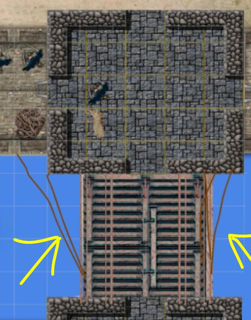 Lo sguardo può facilmente posarsi sulle pesanti corde saldamente legate alle merlature a est, che sono tese fino al ponte levatoio, nelle cui intravature sono infisse.