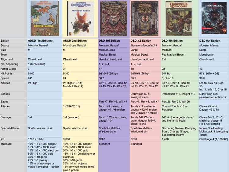 Cos'è mezzo-umano e mezzo-leone o mezzo-capra o mezzo-cervo o mezzo-serpente o mezzo-sciame di insetti? Si tratta della lamia, una creatura il cui aspetto (e ciclo riproduttivo) è cambiato notevolmente nel corso di quattro decenni di apparizioni in D&D.