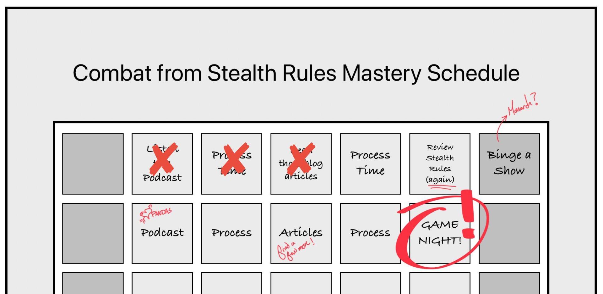 Prendi "padronanza delle regole" ad esempio. È un'area che voglio migliorare quest'anno, ma io gioco principalmente Pathfinder 2E, così ci sono centinaia di pagine di miglioramento. Invece di farmele tutte in una volta,  scaverò in un' area specifica. Il combattimento per esempio.