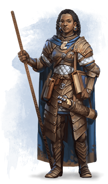 Clad in plate armor that gleams in the sunlight despite the dust and grime of long travel, a human lays down her sword and shield and places her hands on a mortally wounded man. Divine radiance shines from her hands, the man’s wounds knit closed, and his eyes open wide with amazement.