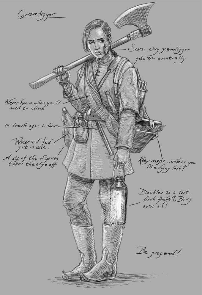 Il Pozzo (Well, NdT) del titolo è il fulcro stesso dell'ambientazione, una voragine profonda centinaia e centinaia di metri costeggiata da una scalinata a chioccola, attorno a cui si è sviluppata la civiltà di cui fate parte. Gli uomini hanno colonizzato la pietra attorno alla scalinata, costruendo le proprie case in caverne naturali o artificiali, spostandosi sempre più in basso mano a mano che le risorse iniziano a sparire e le tombe diventano sempre più numerose. Ma c'è qualcosa di oscuro in atto nel Pozzo, una forza misteriosa che anima i morti del passato e li trasforma in mostruosità di ossa e carne. I giocatori giocheranno dei Becchini (Gravedigger, NdT), delle persone che per qualche ragione (Coraggio? Curiosità? O forse semplice amore per il rischio?) decidono di partire da Bastione, l'Ultima Città, ed esplorare i livelli superiori in cerca di fortuna, fama e risposte sui misteri che avvolgono il Pozzo.