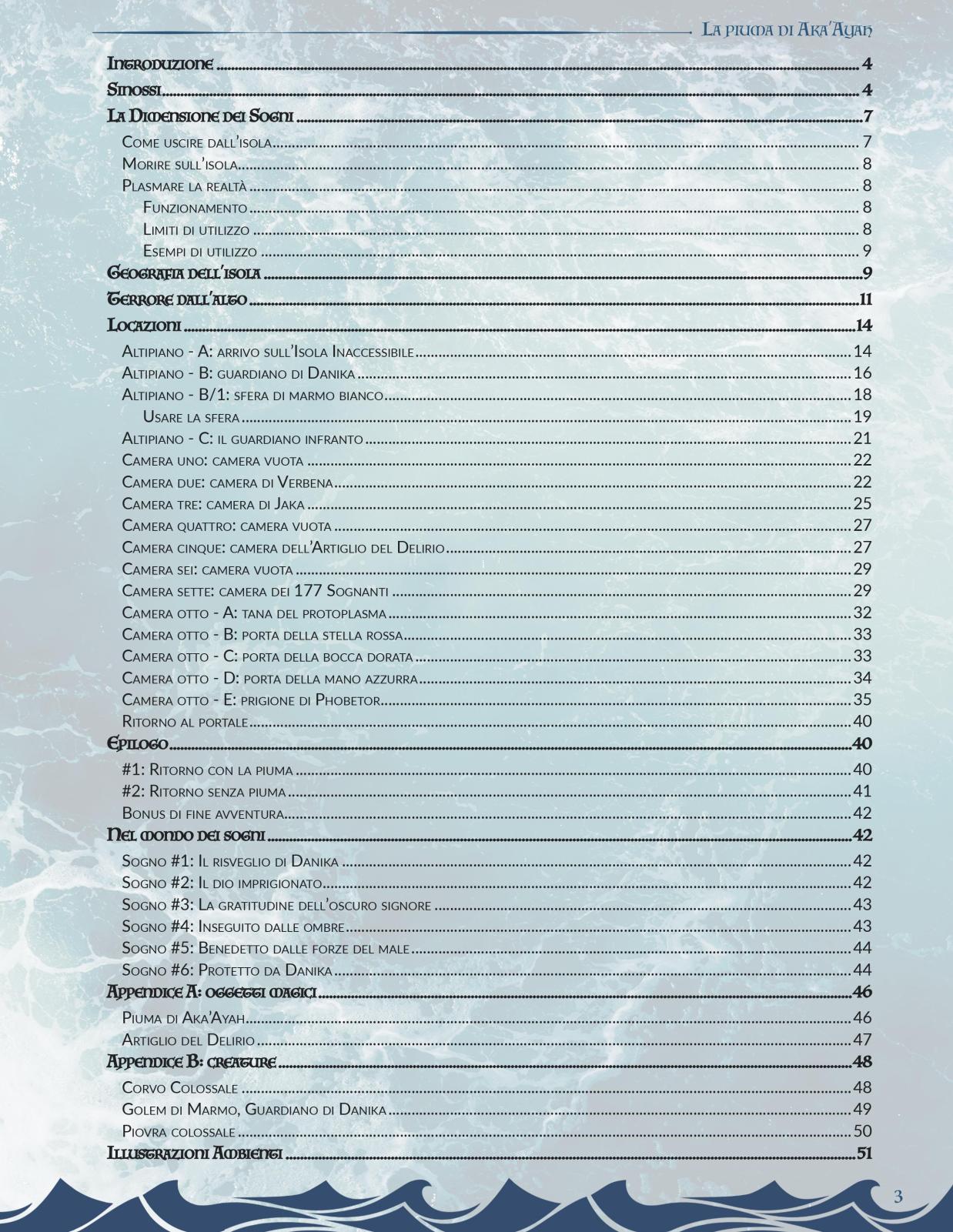 La prefazione citata nel testo ci fornisce ulteriori suggerimenti a cosa troviamo in queste pagine: non è tutto come sembra. Ci sono profondi misteri da scoprire sull'origine dell'isola, ma anche sul perché la Piuma sia sparita di circolazione. Risparmiandomi dallo sfociare in Spoiler eccessivi posso dire che Leonardo mantiene costante il profilo di "classicità" dell'avventura, infatti gli avventurieri si troveranno ad affrontare un Dungeon verticale, suddiviso in livelli, sotto la costante pressione di innumerevoli minacce.