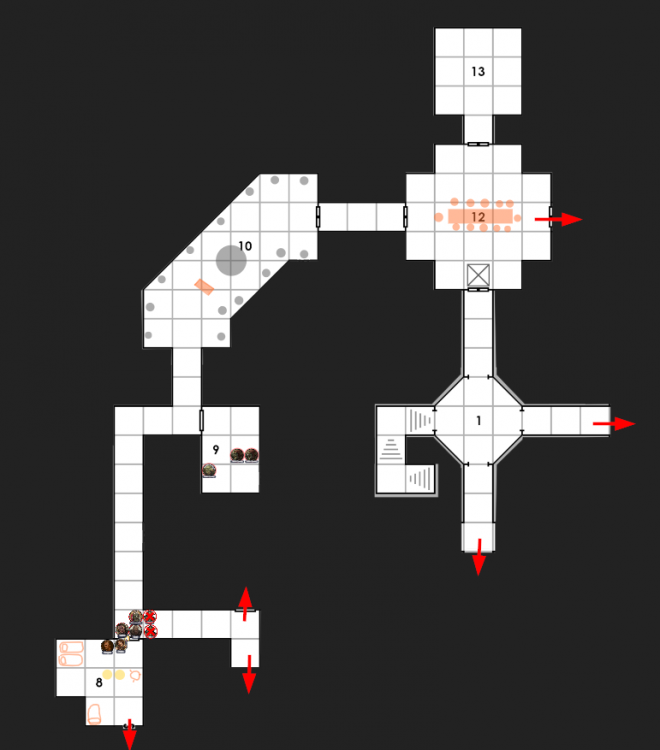 Congratulazioni, c'è l'avete fatta. Devo dire che a l'inizio temevo che finisca in TPK. 😅 Vi metto la mappa del dungeon e delle zone esplorate fin'ora. Le frecce rosse indicano dei passaggi verso delle zone inesplorate.3 punti