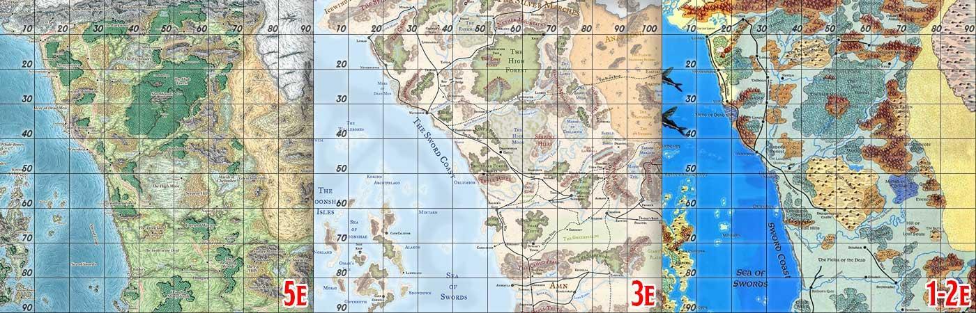 Come accennato, lo scopo dell'articolo è analizzare dal punto di vista geografico le differenze tra le mappe dei Forgotten Realms, limitatamente al continente principale del Faerûn. Mostreremo in ordine cronologico le mappe come sono apparse nelle varie edizioni e le confronteremo tra loro. Dato che alcune mappe le abbiamo disponibili solo in formato digitale, chiariamo subito che le misurazioni da noi riportate non sono precise "al miglio", ma potrebbe esserci un certo scarto di 3/5 miglia specie su lunghe distanze. Il forum limita la grandezza delle immagini a 1.920px. Molte immagini, in particolar modo quelle usate per comparare le mappe delle varie edizioni, arrivano anche a 5.000px. Per scaricare la mappa in alta risoluzione forniamo il link direttamente nella didascalia dell'immagine. Ed Greenwood Prima ancora che la TSR (l'editore originale di D&D) pubblicasse l'ambientazione, il suo creatore Ed Greenwood aveva disegnato la mappa dei Forgotten Realms su 24 fogli letter (215,9 x 279,4 mm). Ne abbiamo parlato in questo nostro articolo, dove trovate il link ad altre mappe originali di Greenwood. Attaccando tutti i fogli assieme, il risultato finale è questo: Faerûn, Mappa Originale – Ed Greenwood (scarica in alta risoluzione) La mappa riportata sopra è importantissima perché è la base delle mappe successive le quali, come vedremo, la riproducono fedelmente almeno fino al 2000. EDIZIONI TSR AD&D 1a Edizione La TSR nel 1987 pubblica il Forgotten Realms Campaign Set chiamato "Old Grey Box" con al suo interno ben 4 mappe in formato poster. Due di queste ci mostrano l'intero continente del Faerûn, mentre altre due sono il dettaglio della zona centrale dei reami (Cormyr, Valli, Mare della Luna). La mappa del Faerûn al suo interno è questa: Faerûn, Forgotten Realms Campaign Set 1e (1987) – (scarica in alta risoluzione) Sottolineiamo ancora, che la mappa sopra riportata, sono 2 mappe unite assieme e ci mostra il Faerûn dalla Spina Dorsale del Mondo a nord fino alle Giungle di Chult a sud, e dalle Isole Moonshae a ovest, fino alle terre del Thay a est. La mappa è molto fedele all'originale di Greenwood. Qui potete trovare una nostra recensione su questo boxed set. The Forgotten Realms Atlas Nel 1990, poco dopo l'uscita della seconda edizione di AD&D, la TSR pubblicò un supplemento per i Forgotten Realms dal titolo The Forgotten Realms Atlas. Questo meraviglioso supplemento geografico contiene dozzine di mappe disegnate a mano in 3 colori che coprono i 13 romanzi pubblicati fino ad allora e contiene una mappa completa dei Forgotten Realms, che va dal Mare senza Tracce a ovest fino al Mare Celeste ad est. Comprende quindi sia il Faerûn che le terre di Kara-Tur. La mappa al suo interno (della parte centro-occidentale) è questa: Faerûn, The Forgotten Realms Atlas 2e (1990) – (scarica in alta risoluzione) Questo supplemento ha il merito di mostrarci, per la prima volta, l'intero continente. Si vede chiaramente la parte centrale (il Deserto di Raurin, il Semphar), la parte meridionale (Halruaa, Dambrath, Luiren, Var il d'orato) e si spinge ad ovest fino a mostrarci l'isola di Evermeet e la sua distanza dalla Costa della Spada. Queste mappe riprendono un po' lo stile della mappa originale di Greenwood e sono sorprendetemene dettagliate. Infatti riportano moltissimi insediamenti che fino ad allora non venivano mostrati nelle mappe ufficiali. AD&D 2a Edizione Finalmente, nel 1993, la TSR pubblica la nuova versione del boxed set dei Forgotten Realms, la quale va a sostituire il vecchio "Grey box". Il nome è identico: Forgotten Realms Campaign Setting 2nd edition. Ancora una volta nella scatola troviamo ben 4 mappe. Due ci mostrano l'intero Faerûn e due la parte centrale dei reami (esattamente come nella prima edizione). Ciò che cambia è lo stile della mappa e la quantità di punti d'interesse. In oltre 6 anni i Forgotten Realms erano cresciuti parecchio. Lo stile della mappa è il seguente: Faerûn, Forgotten Realms Campaign Set 2e (1993) – (scarica in alta risoluzione) Anche in questo casa, a parte il nuovo stile grafico, la mappa rimane fedele all'originale. Di nuovo, quello che vedete sopra, sono due mappe unite assieme. Forgotten Realms Interactive Atlas Questo supplemento elettronico fu pubblicato dalla Wizard of the Coast nel 1999 in collaborazione con la Pro Fantasy Software (quelli del Campaign Cartographer). Lo inserisco nella categoria TSR per due motivi: il primo è che è un supplemento per la seconda edizione del gioco, ma, trattandosi di mappe, la cosa non è così fondamentale. Il secondo è che le mappe sono in linea con quelle pubblicate fino a quel momento. Hanno la stessa scala e riproducono geograficamente i reami allo stesso identico modo. Descrivere in poche righe il FR Interactive Atlas non è facile. Esso ci mostra per la prima volta l'intero globo di Toril e al suo interno ci sono oltre 800 mappe vettoriali (anche di città, dungeon, rovine, ecc.) riprodotte con uno stile che ricorda quello delle mappe 2e. Ma non solo: le mappe sono collegate tra loro da link ipertestuali. Penso che ogni mappa dei Forgotten Realms realizzata fino all'acquisizione della TSR da parte della WotC (1997) sia in questo supplemento, comprese le terre di Kara-tur, Maztica e Zakhara. Riportiamo la mappa dell'Alta Brughiera, la zona che va tra Waterdeep e il deserto di Anauroch: Faerûn, Alta Brughiera, Forgotten Realms Interactive Atlas (1999) – (scarica in alta risoluzione) Come potete notare, alcune località sono scritte in viola. Significa che sono link e che cliccandoci sopra si apre la mappa (o le mappe) di tale località. Le mappe sono molto dettagliate e riportano moltissimi insediamenti e punti d'interesse. Per la prima volta, inoltre, ci viene mostrato l'intero mondo di Toril. La prima mappa del mondo di Toril, Forgotten Realms Interactive Atlas (1999) Toril visto dallo spazio, Forgotten Realms Interactive Atlas (1999) Comparativa fino a questo punto... Fino a qu