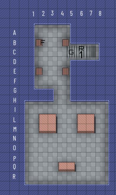 Grim scende cauto, tastando ogni passo e mantenendo i sensi all'erta. Dopo una lenta discesa tocca finalmente il suolo, rimanendo col fiato sospeso, in attesa di qualcosa che però non arriva. Tutto rimane silenzioso e tranquillo. Con un cenno anche gli altri scendono cauti. Vi ritrovate in una stanza molto grande, quadrata, dal soffitto alto quasi 9 metri, da un foro sul quale vi siete calati. Siete vicini a una grande piramide, con una gemella poco oltre. In fondo alla stanza una terza piramide, ancora più grande, con la superficie lucida quasi a specchio formata da una pietra dura finemente lavorata, tanto che le giunte tra i blocchi sono quasi invisibili. Dietro le due piramidi un corridoio si allontana dalla stanza leggermente in salita. Fjodor cerca attento in tutta la stanza, tastando pavimento e muri, senza trovare nessun pericolo nascosto. Mentre esplorate la stanza, un suono di pietra che striscia sulla pietra proviene dalla cima della scala da cui siete scesi, fino a fermarsi con un sonoro tonfo.
