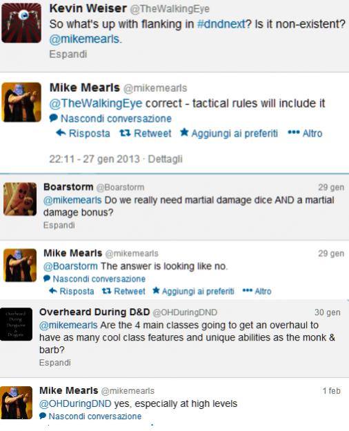 Aggiornamento: John Proudfoot @GX_Sigma @mikemearls I want to play a game where natural self-healing is slow, and healers are not required. Will modularity allow me to do that? Mike Mearls @mikemearls @GX_Sigma Yes, that's where I see hit dice coming in. Reduce the rate at which you get them back to regulate natural healing rate. "Some people asked about the warlord - the class deserves an L&L of its own, along with an update on classes in general. Long and short of it is that there should be a tactical/commander guy in the game, but it might not have healing and might be a type of ftr. And when I say healing, think of it in terms of use X to give back hit points. There are other ways to mitigate damage or keep PCs going."