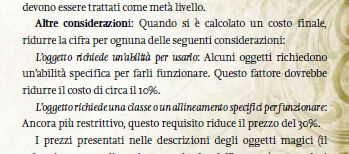 tratto dal manuale Sono cumulative queste cose? - Ovvero l'oggetto richiede Utilizzare Congegni Magici e Sapienza Magica. Il costo viene ridotto del 10% due volte (ovviamente non del 20%) - Oppure l'oggetto funziona solo se hai l'allinemaneto Legale Neutrale e se sei un Guerriero. Il prezzo viene ridotto del 30% di due volte (ovviamente non del 60%) Io non ci vedo nulla di male in quello che ho affermato. Tu che ne pensi. P.S.: ho controllato in inglese è scritto "paro paro" come è stato tradotto