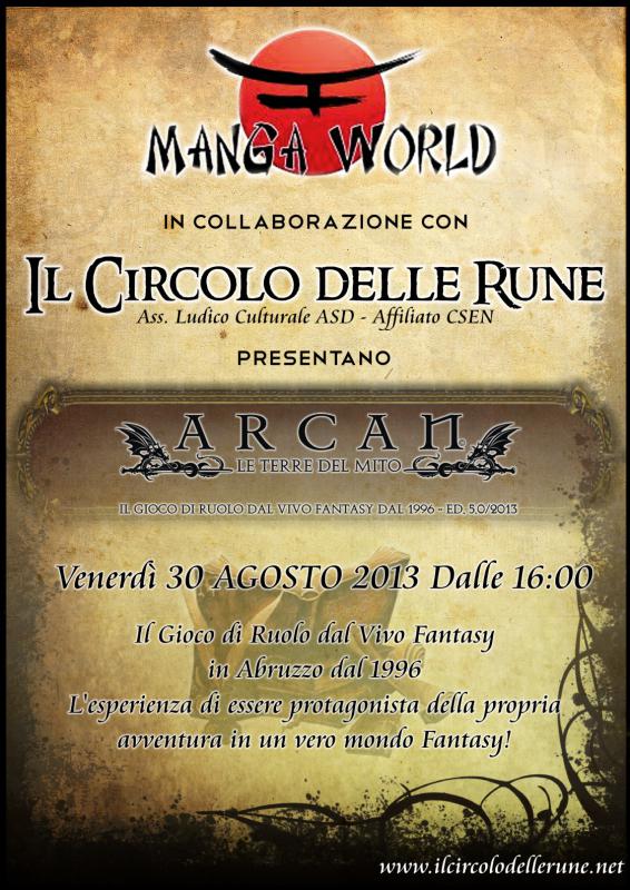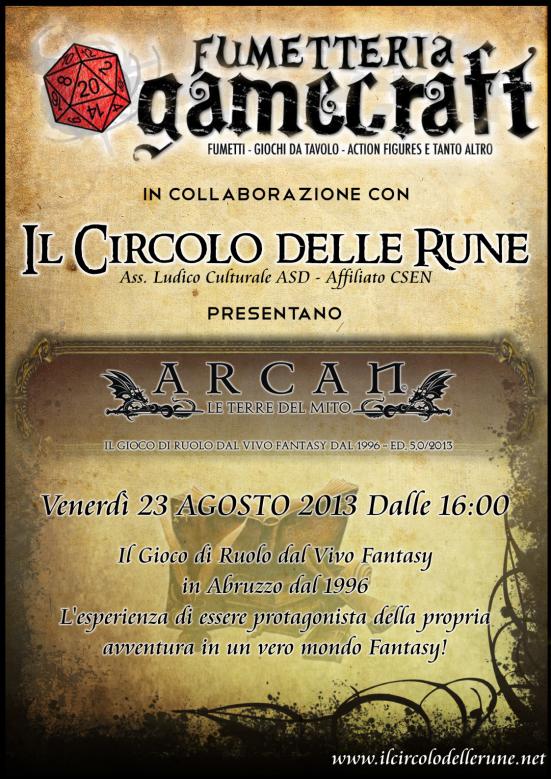 Salve ragazzi! Il Circolo delle rune, per promuovere le proprie attività ludiche, venerdì 23 agosto sarà alla Fumetteria Gamecraft in Via Benedetto Croce 147 a Chieti scalo, mentre venerdí 30 farà un salto a MangaWorld, in Via Martiri di Cefalonia a Pescara, a presentare il fantastico mondo di ARCAN: le terre del mito, la NOSTRA ambientazione fantasy per il gioco di ruolo dal vivo… Saranno presenti alcuni esponenti del Circolo, pronti ad introdurvi nell’ambientazione ed a rispondere ad ogni vostra domanda. Porteremo alcuni pezzi di equipaggiamento, per darvi modo di assaporare ció che sará il gioco, ed un assaggio dei manuali, per permettervi di capire in modo consono le meccaniche. Alcuni degli espositori daranno anche una dimostrazione di combattimento Fatevi vivi, vi ruberemo l’anima…