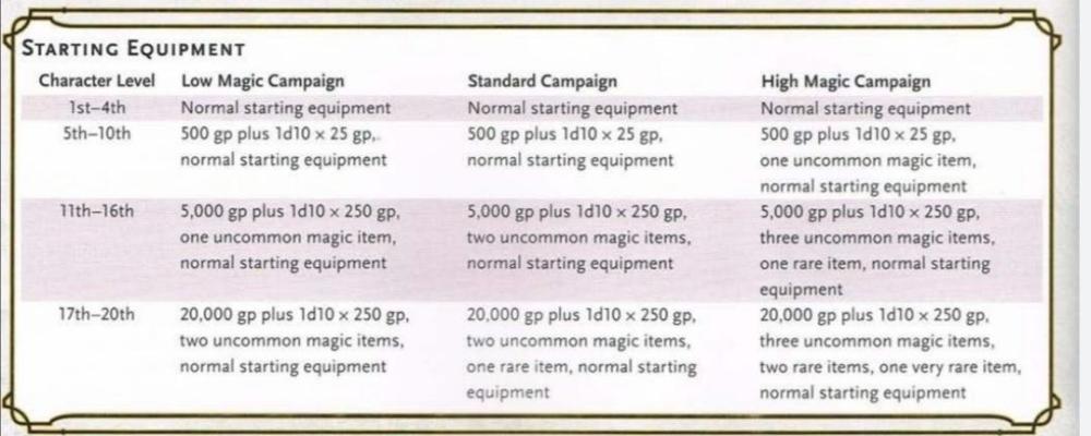 Minsc ha risposto a Azog il Profanatore a un discussione La Tomba degli Orrori Tds in Tomb of Horrors@Azog il Profanatore per esempio questa è la tabella del manuale del master con l'equipaggiamento iniziale consigliato per ogni tier di gioco per una campagna low magic, una standard ed una high magic. Per il tier 3 di gioco (liv 11-16, dove siamo noi) consigliano 1 uncommon, 2 uncommon o 3 uncommon+1 raro più 5250/7500 mo in base a che tipo di campagna si sta giocando. Può aver senso anche giocare senza oggetti magici, come dare oggetti molto rari e leggendari a pioggia, dipende sempre da che tipo di avventura si sta per giocare, quanto è diffusa la magia nel mondo di gioco, quanto può essere difficile l'avventura, se e quanti oggetti si troveranno andando avanti. Dipende da davvero troppe cose, non c'è una risposta giusta univoca. Ci si deve solo affidare al master che deve bilanciare il tutto
