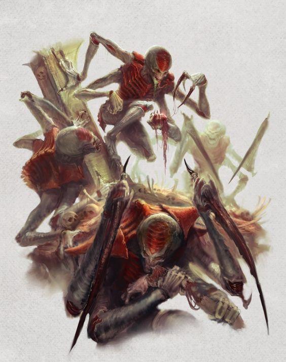 1. Hyde piomba sull'eldar colpendolo con lo zpakka e fracassandogli l'armatura di spettrosso sul petto. Dalla spaccatura emergono subito due arti sottili, culminanti con lame ossee affilate. Altro muco avvolge questi arti e si libera rapidamente nell'aria, mentre potete vedere che dentro l'armatura dell'eldar si nascondeva (a mo' di bozzolo) uno xeno a metà tra l'artropode e il rettile. Nessuno di voi riesce ad identificarlo, ma è chiaramente un organismo tiranide! Uno degli artigli coglie Hyde al volto, strappandogli dell'icore che subito si ghiaccia nel vuoto. Poi un sibilo psichico vi coglie tutti di sorpresa e da dietro l'orrendo xeno emergono due altri organismi tiranidi. Sono ben più grandi di quello che albergava nell'armatura xeno, alti più di un umano, e le lame che hanno al posto della prima coppia di arti sono chiaramente armi letali. Nonostante il vuoto assoluto le creature non sembrano per nulla turbate! Iniziativa Dana (Blessing, 1 danno psichico) Hyde (6 danni da taglio, 1 danno psichico) Tiranidi (8 danni) Vagabondo (1 danno psichico) DePlano (Blessing, 1 danno psichico) BB (Blessing, 1 danno psichico) Dana