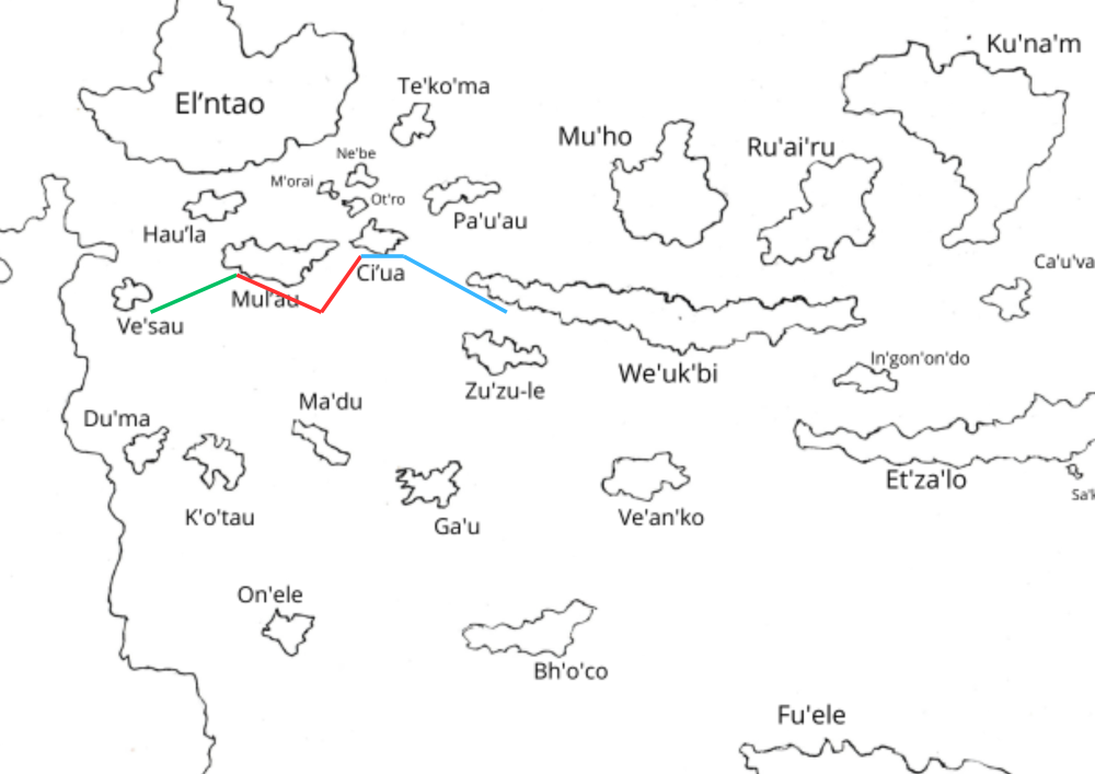 "Io allora andrò a Du'ma-Ti. Dobbiamo fermare i predoni. Sa'm'an, K'atu: vorrei veniste con me" dichiara M'un "Tu, sorella, conosci bene i popoli della regione. E un paio di forti braccia servono sempre per mettere in fuga il nemico e rincuorare chi teme per la propria vita" si rivolge poi a voi "vi auguro un viaggio senza ostacoli, e un pieno successo. Che gli spiriti del mondo ci riconducano qui sani e salvi" I gemelli dichiarano che "andremo a visitare la tomba di En. Vedremo se gli abitanti di quell'isola scenderanno a più miti consigli. Siamo i meno minacciosi e i meno noiosi tra i figli di Za'ia, forse sarà sufficiente" Ch'a'ia, forte (!) della sua costituzione debole, resterà qui ad aiutare Ch'o'be nelle questioni amministrative e spirituali. Impartisce comunque una benedizione a tutti i fratelli e le sorelle. Così organizzati vi preparate per i rispettivi viaggi; la prima vera riunione dei figli di Za'ia così si conclude. Anno 1 dalla scomparsa della regina (913E), piena estate, per mare Note Passano pochi giorni, e vi trovate sulla veloce nave di Ele'wa't'um. Un vascello capace di tenere il mare aperto con facilità, ma anche segnato dalle continue battaglie cui ha partecipato. Là dove lo scavo è stato danneggiato dalle prue nemiche, e poi riparato da sapienti maestri d'ascia, sono dipinte cicatrici bianche. Ciascuna racconta di una volta che la nave invece di affondare ha prevalso sugli avversari. L'equipaggio è molto simile: veterani fedelissimi al loro capitano, esperti tanto di mare quanto di faccende di sangue. La presenza di tanti eredi di Za'ia li mette però in soggezione. Il tempo è ottimo, il vento vi favorisce. Ben presto lasciate il porto alle spalle e vi avventurate nel profondo blu di P'wath.