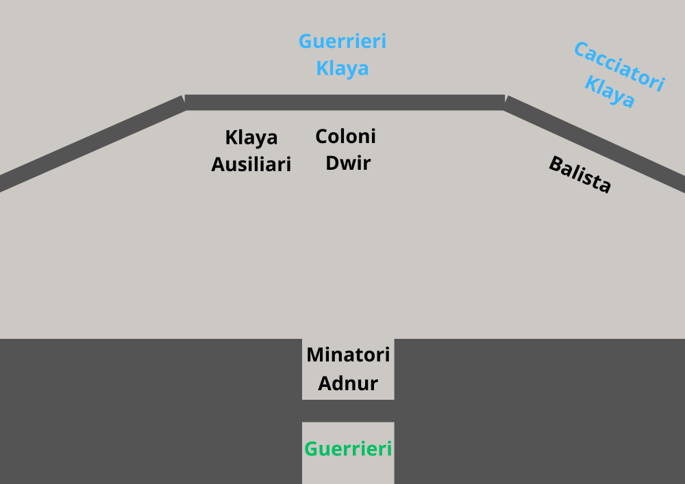 35 di tro La battaglia procede su due fronti, e per la prima volta gli Adnur disertano la prima linea per recarsi nelle retrovie, guidati da Moggo in persona. Morla resta sugli spalti a tenere in riga coloni e ausiliari, mentre Andr continua a tenere intera la sua balista magica. Sulle mura i coloni soffrono gli strali klaya nonostante la protezione delle difese in pietra. Il sangue dwir viene versato anche oggi. Di contro le forze del nemico non vengono ridotte di molto. Ma è nel tunnel che la battaglia si fa più violenta: quasi duecento uma spinti in avanti dai loro padroni pressano contro solo sei guerrieri, che supportati dai minatori tengono la posizione per ore. Alla fine è sufficiente: le asce Adnur scavano un solco profondo tra gli schiavi pallidi e verso sera questi ultimi rifiutano di avvicinarsi oltre alle forze dwir e infine vanno in rotta. I loro condottieri scelgono di non avanzare, ma si ritirano con troppa disciplina per lasciar presagire una fuga... Ma alla sera la battaglia è conclusa e Kel Kadhar è ancora in mano dei suoi veri signori. Simulazione della situazione attuale Plinek lavora celermente sfruttando la fuga degli schiavi uma per chiudere l'accesso ai tunnel. Ciò terrà lontani i thusiani per un po', ma sapete che loro stessi scavano la roccia viva e probabilmente riusciranno ad entrare se ci si impegneranno. Non sarà facile e non sarà silenzioso, però. D'altra parte avete "chiuso fuori" anche eventuali rinforzi da Kel Boldar. Non che siano imminenti. Quando il sole è già calato, Morla vi raduna con i gemelli e Plinek "Non so quanto ancora potremo resistere. Verrà il momento in cui le mura saranno troppo grandi per le nostre forze. Intanto accorpiamo i minatori con i coloni, per renderli più compatti. Dopo di che dobbiamo pensare ad un piano di contingenza... per fuggire nella fortezza e riprendere l'assedio da lì. Oppure..." vi guarda, si morde il labbro e continua "oppure per compiere una sortita finale" DM - Truppe