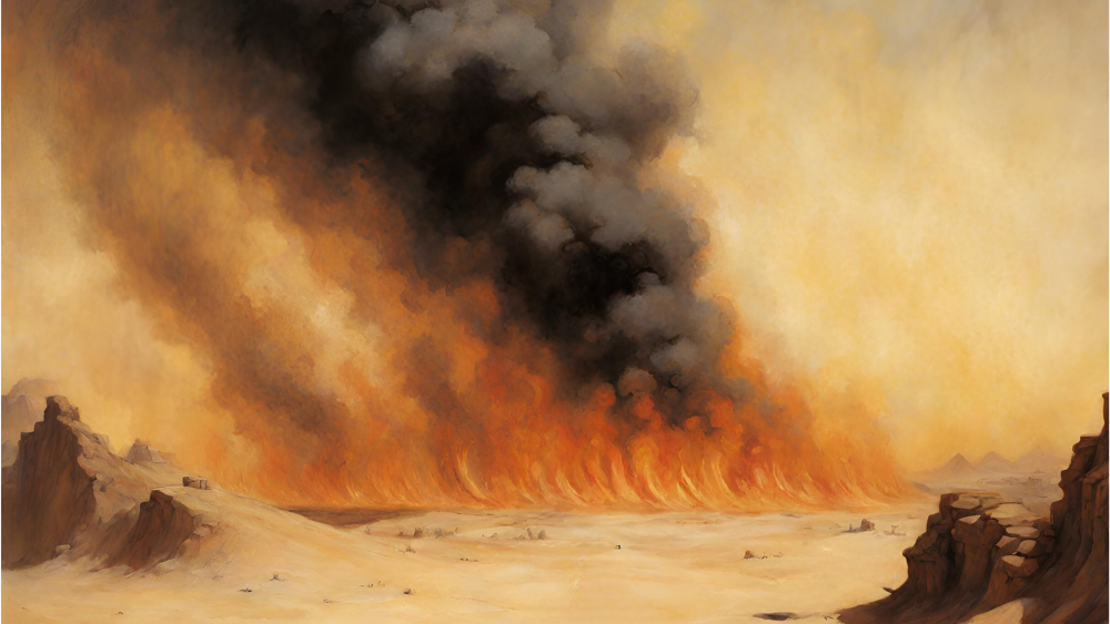 L'afandi non vi ferma, e riuscite a prendere tutti i vostri averi e allontanarvi dalla città. Certo fuori è buio e vi si presenta un viaggio pericoloso, ma tutto considerato non avete tempo da perdere. Con la vostra guida riprendete il viaggio lasciandovi alle spalle una comunità tanto accogliente quanto inquietante. Abbandonare questa festa continua per andare incontro al crudele deserto vi pesa anche se, razionalmente, ormai sapete che questa è una specie di trappola cosparsa di miele. Per tutta la notte viaggiate lesti e guardinghi, seguiti in lontananza da risate ferali, uggiolii, guaiti e veri e propri ululati. Dietro di voi le stelle all'orizzonte si confondono con punti luminosi assai più vicini e temibili, occhi di predatori e mostri che però non si avvicinano mai abbastanza per essere riconosciuti. Col sopraggiungere dell'alba questa presenza diminuisce sempre più fino a sparire. Il viaggio è stato faticoso e vi riposate un poco approfittando delle prime luci per orientarvi meglio. Ma poi l'alba arriva davvero, cogliendovi di sorpresa: il lucore che avevate scambiato per il sole nascente persiste portando con sé un lontano rumore, simile ad un ruggito. Avvicinandovi, superate una collinetta, e davanti a voi si stende un incendio che pare divampare dal terreno del deserto...