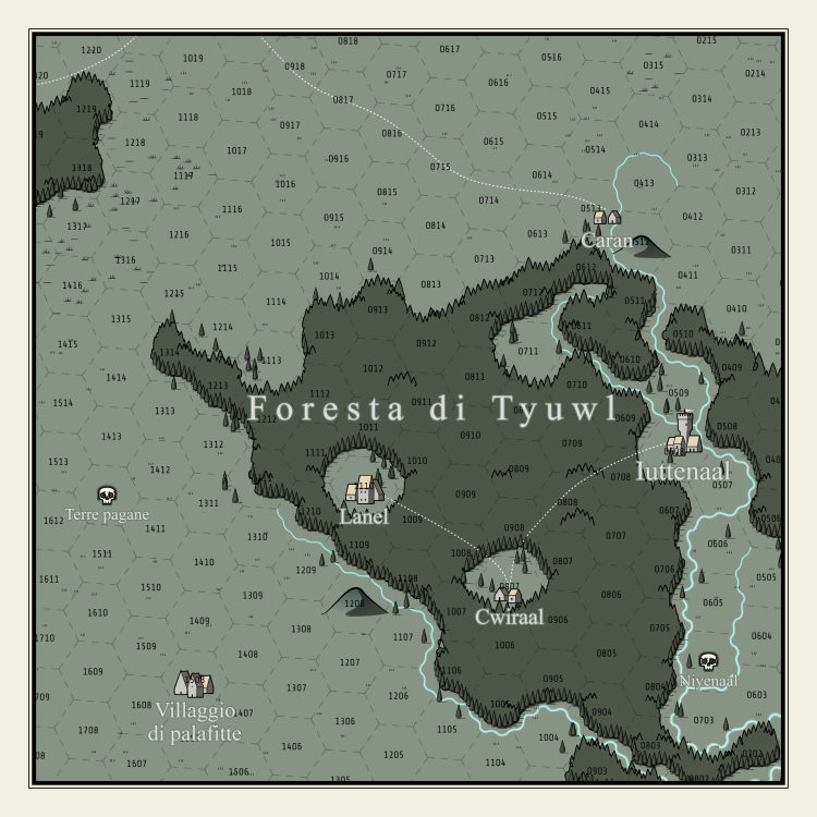 14 di Vedia (fine della primavera) È da qualche miglio ormai che il terreno si è fatto molle e fangoso, quasi impraticabile. I cavalli avanzano con difficoltà sbuffando e scrollando le code, tormentati da nugoli di moscerini. Insetti piccolissimi che non vi pungono ma che comunque vi infastidiscono volandovi addosso. Vi sembra chiaro che ormai siete arrivati nel Tyuwl, ma la foresta vera e propria è ancora poche miglia dinanzi a voi: spettrale, immersa in nebbie e vapori, si erge come una macchia scura in mezzo alla palude. Fate un ultimo sforzo, perché il pomeriggio è avanzato e pensate (sperate) di poter raggiungere la prossima tappa prima del tramonto. Questo secondo le indicazioni del messaggero che vi guida, Cìan, che è del posto e vi promette, giura, che ormai ci siete. Siete quasi arrivati, davvero. A tratti però nemmeno lui ne sembra certo. Ma un'ora dopo arrivate davvero in vista del villaggio di Caran. Sorge proprio al limitare della foresta, delimitato da uno dei fiumi che alimentano la palude, ed è uno dei posti meno piacevoli che abbiate mai visitato. Intanto vi chiedete chi abbia avuto l'idea di costruirlo proprio qui. È un luogo malsano, con i vapori che si levano dal suolo anche ora che il giorno volge al termine e la luce del sole è lontana. Si trova su una specie di isolotto di terreno solido circondato dalla palude vera e propria, ma si è dovuto comunque disporre dei camminamenti di legno per evitare di annaspare nella mota tutto il giorno. E gli abitanti stessi… uomini e donne thuala piccoli, magri, sporchi, che vi guardano di sottecchi e borbottano invece di esprimersi chiaramente. Vi salutano con cenni del capo, ma sembra che la vista di ben due fl'alma li metta in soggezione. Chissà se ne hanno mai visti, di uomini così scuri e alti? Caran avrà forse una quarantina di abitanti, magari qualcuno in più, sparpagliati in una dozzina di case di legno basse e dal tetto coperto d'erba verde. Qui e la i montanti di legno sono decorati con motivi incisi in modo un po' rozzo: spire, onde, fiori, uccelli di palude, pesci... spesso però muschio e melma si sono infilati in queste tacche rendendo le facciate verdi proprio come i tetti, il terreno... è un colore pavido che non ha nulla a che vedere col piacevole verde dei campi primaverili, o con la fiera tonalità propria dello stemma del re. Due soli edifici spiccano sugli altri. Una casa a due piani dall'aria fatiscente ma attualmente abitata, con sopra la porta uno scudo con lo stemma delle accette dorate su fondo... verde, ovviamente... degli Iutten. E una rimessa per le barche vicino al fiume, dotata di un piccolo molo sul quale un uomo col cappello di paglia e la mantella dei barcaioli sta accendendo una lanterna. Ad accogliervi ci sono due armigeri di lord Iutten, riconoscibili per i saie verdi e la cotta di maglia che indossano sotto. Non hanno elmi o scudi, e invece di lance o spade portano a tracolla asce da guerra. Ah, e per il fatto che sono dei quen ben piantati, uomini di ferro in tutto e per tutto. Uno dei due armigeri si fa avanti e prende con cura le redini del cavallo di Di'mo, per aiutarlo a smontare. “Avete fatto tardi, misi signori. La via è stata difficile?" guarda un attimo verso la foresta, a sud, nera e impervia “oramai temo sia troppo buio per raggiungere Iuttenaal. Il barcaiolo non usa viaggiare la notte, e nessuno percorre la foresta coi cavalli. Possiamo prepararvi un alloggio qui, se vossignorie si accontentano di una casa comune”. Non è una proposta molto invitante, ma cosa potete farci? Certo avete fretta, e forse una soluzione si può trovare... NOTE