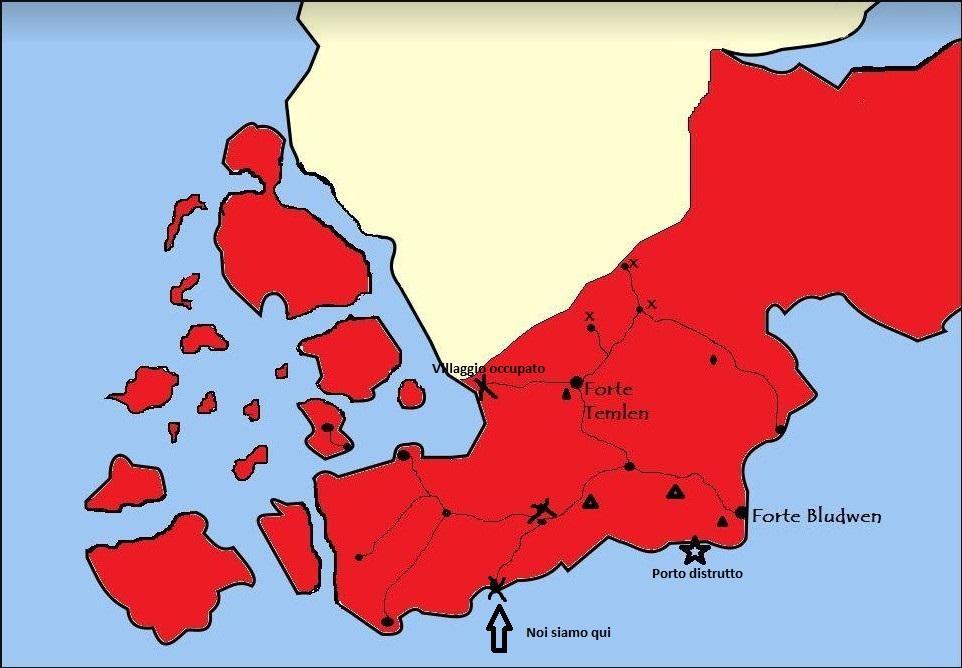 8. Qui potete vedere la mappa le X sono i villaggi/avamposti distrutti, I triangoli sulla mappa sono i campi di prigionia orcheschi. I due forti...sono due forti. La zona gialla e' dove si trova l orda, la rossa quella controllata dagli umani