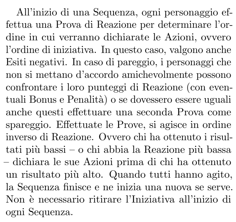 Ma guarda che io sono pure disposto a caricare già online tutto quello che ho scritto, solo che non so dove ahaha Lo carico su github per davvero? Nono non con le carte, la parola chiave qui è pila e provo a farti subito un esempio. Intanto un'infarinatura sul sistema in generale così mi seguite meglio. D8, perché? Il motivo è scemo, sono partito dal d6 che è il dado più comune, i punteggi erano troppo ristretti e non ci si riusciva a giocare così ho aumentato di una taglia, ora ogni punto offre una finestra di percentuali intorno al 12% che mi sembrava accettabile ma in caso ci si mette un attimo a cambiare di nuovo taglia di dado (o a convertirsi a un sistema simil d100 perché in realtà la matrice dei conti è in comune anche se io li ho raccontati diversamente nel manuale). Le caratteristiche, le abilità e in generale qualsiasi punteggio tirabile è un punteggio tra 1 e 8 di partenza eventualmente alterato (non parlo di modificatori tipo bonus a colpire mezzi livelli talenti e cose del genere; le "CD", eventuali tiri contrapposti e qualunque altra alterazione della difficoltà è incorporata nel punteggio da testare). Prendo il tiro di dado, lo sottraggo al punteggio test e quello è il risultato della prova, risultato che come dicevo può significare più cose, da una ferita inflitta a costituire un modificatore per la prova di qualcun altro. Torniamo all'esempio. Io gioco un semplice soldato che chiamerò Primo, con tanto di scudo, lorica e lancia come si addice a un soldato col suo nome. Come schematizzo queste cose in gioco? Uno scudo è un oggetto che posso usare per prendere i danni al mio posto per esempio, una lorica sarà un altro oggetto che ha come effetto principale quello di ridurre l'entità delle ferite che subisco (la descrizione dell'armatura stabilisce per che tipo di ferite questa riduzione può avere luogo, per esempio non funziona se mi faccio male cadendo dal terzo piano, non funziona se cado in una vasca di acido, ma funziona contro le armi perché è fatta apposta), la lancia è un altro oggetto che posso usare per danneggiare qualcuno. Di per sé né la lancia né lo scudo stabiliscono un ammontare di danni che paro o che infliggo, la lancia mi permette di colpire più lontano (perché lo descrivo come un oggetto con portata) e connota le ferite che infliggo come perforazioni e tagli, oltre ovviamente a interagire con l'armatura. Io so cioè che un colpo di lancia può essere ridotto da un'armatura, mentre un pugno verrebbe bloccato completamente. Lo so non per sentito dire ma questi sono oggetti ben descritti già nel regolamento. Di fronte a Primo c'è un altro soldato, che chiamo Livio e che è nemico di Primo. Anche lui è vestito uguale ma ha la lorica di un altro colore. Iniziativa: Io sarei per non tirarla, ma ho scritto la regola così nel manuale: Si tralasci la questione Bonus e Penalità che è saltata nell'ultima versione. Una Sequenza è un round di combattimento, Reazione è una caratteristica dei personaggi, e il gioco procede in ordine di iniziativa inverso. Diciamo che Primo ha un'iniziativa più bassa e dichiara cosa fa per primo (ops). Primo dispone di due Azioni, la sua prima Azione è ingaggiare il nemico entrando nella portata della sua arma con lo scudo alzato. Ora Livio, che dispone sempre di due Azioni non avendo agito, decide di interrompere il turno di Primo per attaccarlo non appena l'Azione di Primo si sia risolta. Attenzione, non c'è un trigger come per un'azione preparata, semplicemente Livio che in iniziativa agisce dopo può chiamare un'interruzione ogni volta che un altro dichiara un'azione e fare qualcosa subito prima o subito dopo che questa azione sia risolta. Sempre. Quindi Livio cosa fa, decide di aggirare lo scudo e attaccare Primo, e lo fa effettuando una Prova contro la propria abilità usata per attaccare, ma il punteggio della caratteristica sarà abbassato di un numero che dipende dalla bravura di Primo nello spostare in giro il suo scudo, e questo perché Primo aveva espressamente dichiarato di avanzare dietro lo scudo in precedenza, quindi questo non consuma altre sue Azioni. Diciamo allora che l'attacco di Livio ha successo nonostante lo scudo di Primo, e la narrazione sarà qualcosa del tipo "Livio fa un piccolo balzo e cerca di affondare la sua lancia sopra allo scudo di Primo per colpirlo in volto *tira, ci riesce*, riuscendo a scalfire le sue difese". Non importa che il colpo sia un colpo mirato perché la gravità della ferita è comunque stabilita dai tiri e non c'è verso di portarsi a casa una ferita più grave cambiando destinazione del colpo. Se la ferita è lieve, come ci si aspetta per via dello scudo e dell'armatura Livio avrà giusto graffiato Primo sul naso o anche meno (dipende dai numeri esatti, una ferita con effetti veri per ora è da sopra al 3 ma la matematica ha bisogno di tanto lavoro ancora). Ora entrambi dispongono ancora di un'Azione e badate bene è sempre il turno di Primo, se al turno di Livio lui non disponesse più di Azioni si passerebbe alla prossima Sequenza. Primo poteva però decidere di interrompere a sua volta l'attacco di Livio, stabilendo di usare un'Azione per intercettare il colpo con lo scudo. Cosa cambia rispetto allo scenario precedente? La differenza è che siccome adesso l'azione non è più di Livio ma di Primo, è quest'ultimo a prendere il controllo della narrazione. Allora la narrazione di Primo sarà probabilmente qualcosa di più simile a "Spintono la lancia di Livio con il mio scudo cercando di assorbire il colpo *tira, stavolta la prova è di Primo e Livio stabilisce la difficoltà mentre nel caso precedente era il contrario, quindi nel caso precedente si dava per scontato che ci fosse un attacco e se ne determinava in qualche modo l'entità, adesso è scontata la parata invece*" e a seconda del giudizio dei dadi lo scudo subirà dei danni oppure no, o in caso di terribile fallimento Primo potrebbe comunque subire un colpo. Un'altra differenza ris