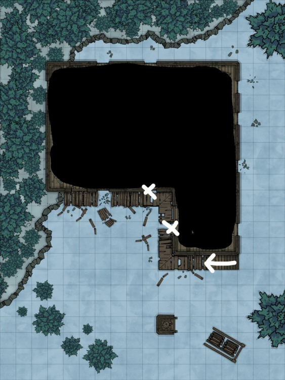 1. Mentre vi avvicinate, stimate che la palafitta che sorregge la baita è alta circa sei metri, e il passaggio per arrivare a essa è completamente coperto di neve. Ci sono delle finestre, ma nessuna luca sembra uscire da esse. Il legno della passerella, che vedete sotto la neve, sembra essere vecchio e danneggiato.