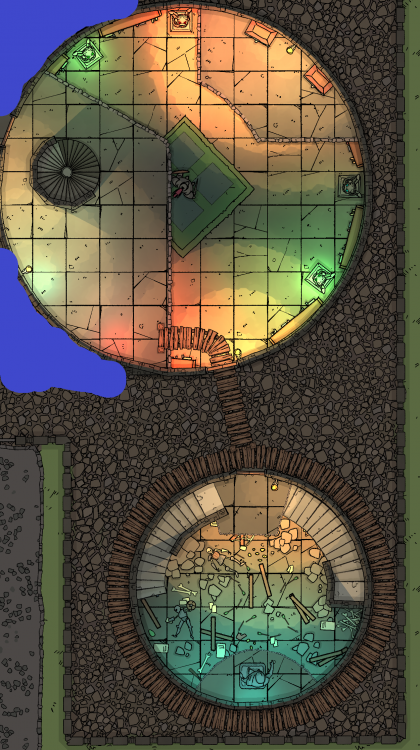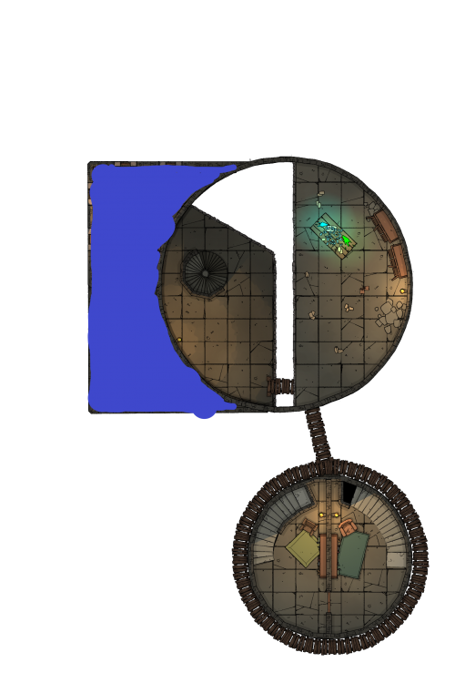 21. Il gruppo si raduna nuovamente sulla passerella esterna e stavolta si dirige alla Torre più alta che sovrasta l'edificio a due piani. Il vento ancora fa ondeggiare il camminamento e scricchiolare il legno sotto i piedi. Sahid porta la mano alla porta ... ma la trova aperta! La passerella di legno prosegue fino ad una piattaforma di pietra senza ringhiere che si sporge sul vuoto del piano sottostante. Una scala a chiocciola scende dalla piattaforma al piano inferiore mentre una porta singola in legno rinforzato probabilmente permette l'accesso all'edificio. Dall'altra parte dello spazio che si affaccia sul piano inferiore, si trova una seconda pedana di pietra con una fiaccola ad illuminare una coppia di scrigni. Nessuna rampa permette di accedervi. Inoltre Sahid vede chiaramente una rampa di scale salire verso il piano successivo, ma i gradini sono traslucidi e si rende conto che è solamente la magia del mantello a mostrarglieli. E dal piano superiore, sente provenire una litania continua, una coro di voci che parlano una lingua per lui incomprensibile. @Madlefty Piano inferiore Mappa