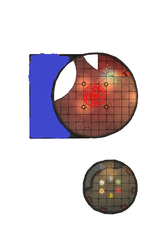 18. Senza indugio Sahid riprende la corsa seguito dalla coppia di nani. I pesanti stivali fracassano diversi cocci di vetro ed il rumore si diffonde per tutta la stanza *crik* *crok*. Quando supera la seconda rampa di scale si ritrova su un'altra piattaforma, collegata ancora una volta alla successiva da un rampa di scale invisibili - non per il guerriero. Ma ciò che vede lo fa arrestare sull'ultimo scalino. Al centro della stanza, racchiuso in un circolo di rune tracciate con il sangue ed illuminato da quattro bracieri di ferro, si erge un essere dai tratti bestiali alto come due uomini, col corpo possente ricoperto di una folta pelliccia bruna e con lunghe zanne sporgenti. La creatura è completamente immobile, con gli occhi chiusi. Tre uomini in lunghe toghe nere sono disposti attorno al cerchio e con le braccia alzate cantilenano una litania in una lingua incomprensibile. All'arrivo di Sahid si voltano ad osservarlo ed aggrottano la fronte ma la litania non smette. Il guerriero di Calim vede una goccia di sudore scendere dalla tempia di uno degli uomini ... Mappa @Madlefty