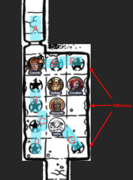 Maestro Menatorio ha risposto a Maestro Menatorio a un discussione Gioco - Winter's Daughter in Gilda della vecchia scuolaGli avventurieri penetrano lentamente nella stanza, assicurandosi di essere molto cauti. Le statue, ormai danneggiate giacono sul pavimento freddo della stanza. Un odore molto potente di muffa e di umidità si sente e esso sembra provenire dalle pareti che sono ricoperte di muffa gialla e viola. Sul muro alla loro sinistra [est], gli esploratori possono percepire l'affresco in modo più chiaro. Da ciò che si vede, il dipinto murale ritrae un cavaliere in armatura e due molossi al suo fianco che combattono un esercito di fate. La muffi ricopre purtroppo la maggior parte dell'opera e molti dettagli sono nascosti. Per quanto riguarda le armi delle statue, ce ne sono otto e sono in condizioni variabili... Garreth cerca di fare luce ai compagni con la lanterna mentre Coraline guarda con grande attenzione l'affresco sulla parete.