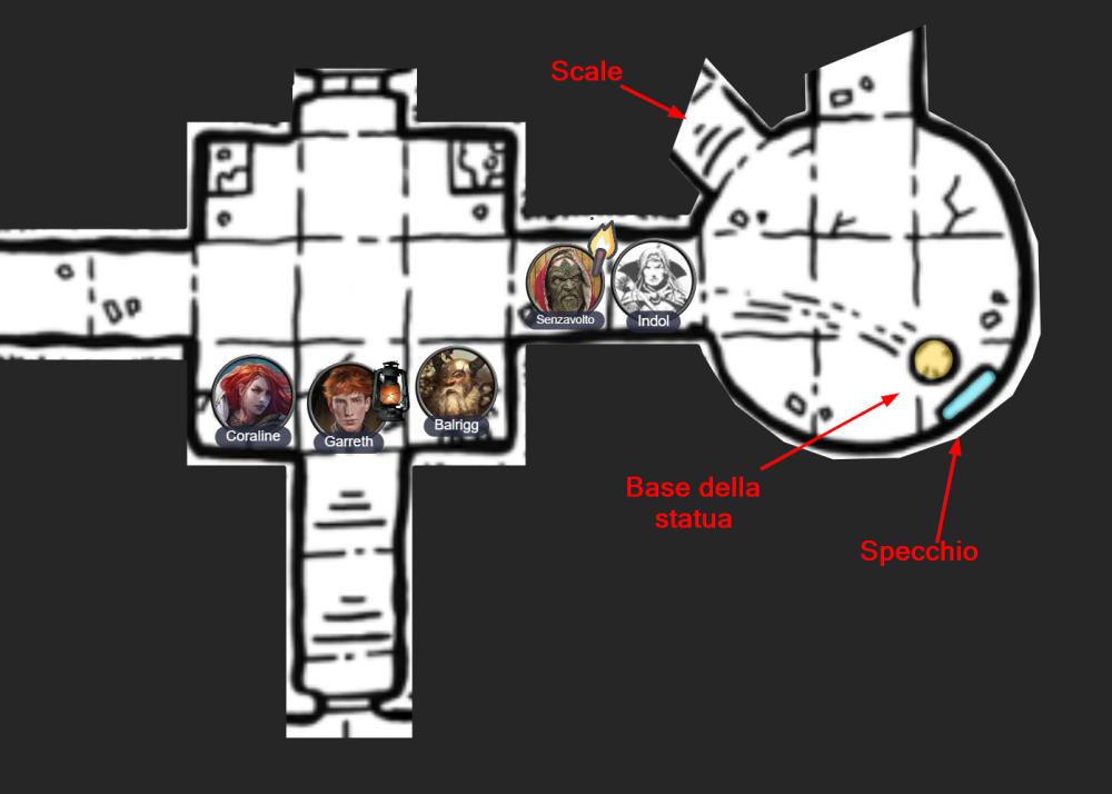 20. Mentre gli altri rimangono in superficie, Garreth prende in prestito la lanterna di Coraline. Senza salutare i suoi compagni, il ladro penetra nella tomba scendendo per le sale che, ora che sono illuminate sembrano ristringersi. Il rosso si rigira un'ultima volta e previene: Torno subito... Nel frattempo, il resto della compagnia si prepara alla prossima fase della spedizione. Chissà quali pericoli possono nascondersi in questa antica tomba? Dopo una decina di minuti, Garreth riemerge dalla porta, coprendosi gli occhi, accecato dalla luce del giorno. Ho cercato bene, dice, non ci sono trappole. L'unica cosa strana che ho trovato è che sembra che sia stato trascinato qualcosa di molto grosso e pesante su per le scale tanti anni fa. Garreth si interrompe un attimo riprendendo fiato e poi continua. Ho guardato bene sul pavimento e le pareti, niente trappola, mai il corridoio diventa più stretto a misura che si scende e sbocca in una stanza, direi, di grandezza media. Il ladro fa un'altra pausa, bevendo un goccio d'acqua dalla borraccia e riprende. Non sono entrato nella stanza, ma dalle scale sono riuscito a vedere che ci sono due grandi porte di fronte all'ingresso, sul muro dall'altra parte. Inoltre, ci sono anche due aperture che sembrano dare su due corridoi, uno a destra e uno a sinistra. La funzione che ha la sala non è chiara, ma ho notato quattro plinti, uno in ogni angolo. Su essi sembrano esserci vari oggetti, ma sono ricoperti di polvere in modo che io non possa distinguerli. Ecco tutto, conclude candidamente Garreth prima di dissestarti con un ultimo sorso d'acqua.