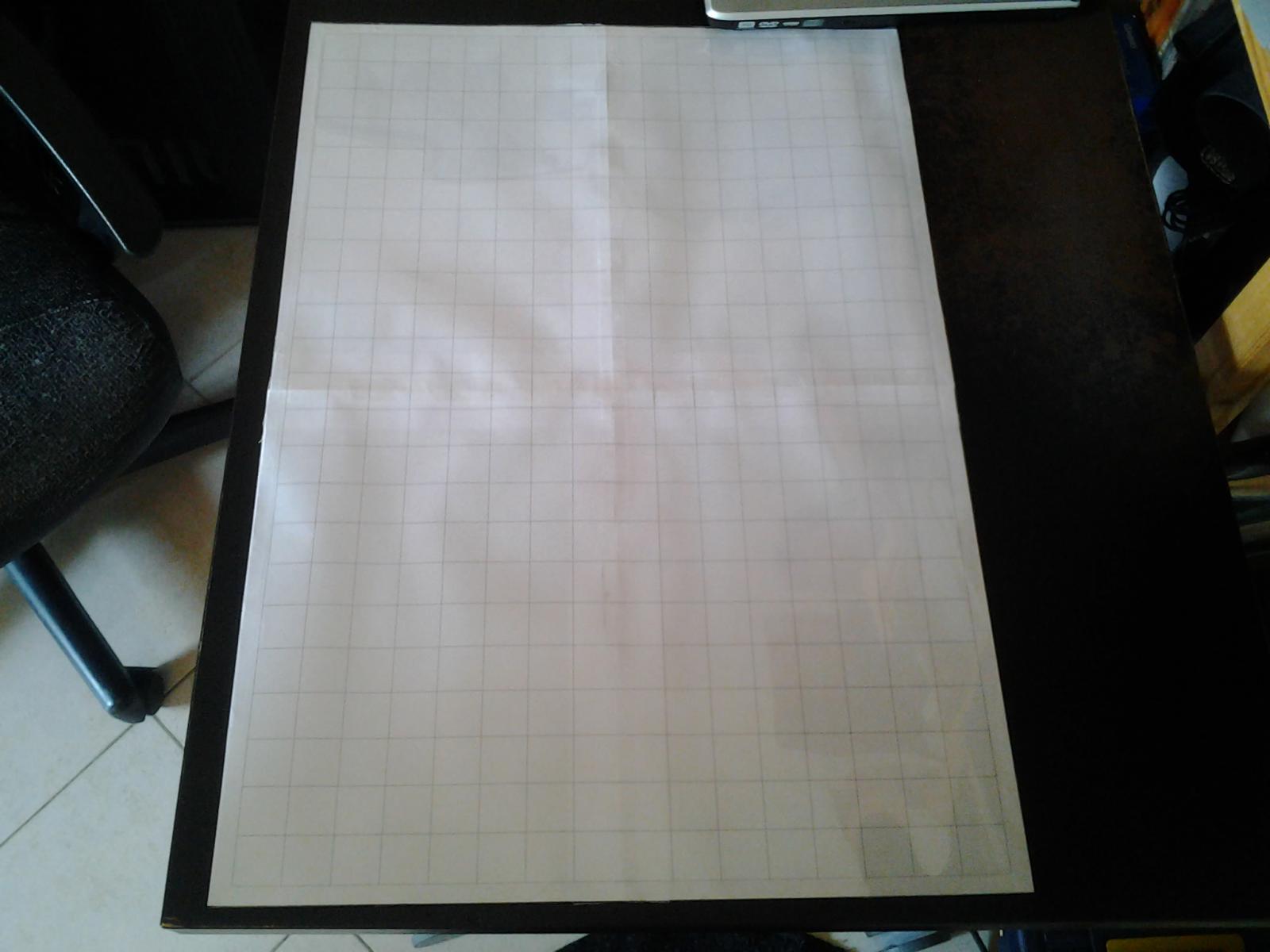 Puoi sempre usarne 4 e raddoppiare la superficie, ti basta farli combaciare e unirli, magari potresti usare dei cartoncini da attaccare sotto ai fogli in modo da rinforzarli e unirli col nastro telato che è resistente e flessibile, così otterresti una griglia piegabile. (Mi sa che domani ci provo a farla così ) Aggiornamento delle 12:22. L'ho fatta ieri sera sul tardi, ogni quadretto misura 2.50 cm a lato (fatto con il pc) per un totale di 368 quadretti. Esteticamente non è niente di speciale ma l'importante è che funziona molto bene ed è molto comoda. Sul retro ho messo dei cartoncini neri, cosi è anche più rigida. Stasera il battesimo del fuoco.