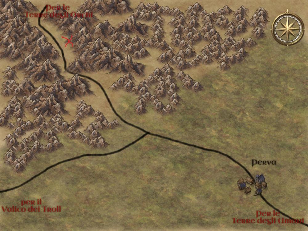 Beh, non è che abbiamo poi molto da darvi... dice Siravice, guardando verso il resto della compagnia in cerca di supporto posso offrirvi un centinaio di monete d'oro a testa, ma nulla di più mentre il capovilaggio sta ancora parlando, interviene il ragazzo, che domanda curioso verso il Goliath Cos'è un "dungeon"? è una parola della tua razza? In spoiler la mappa della zona