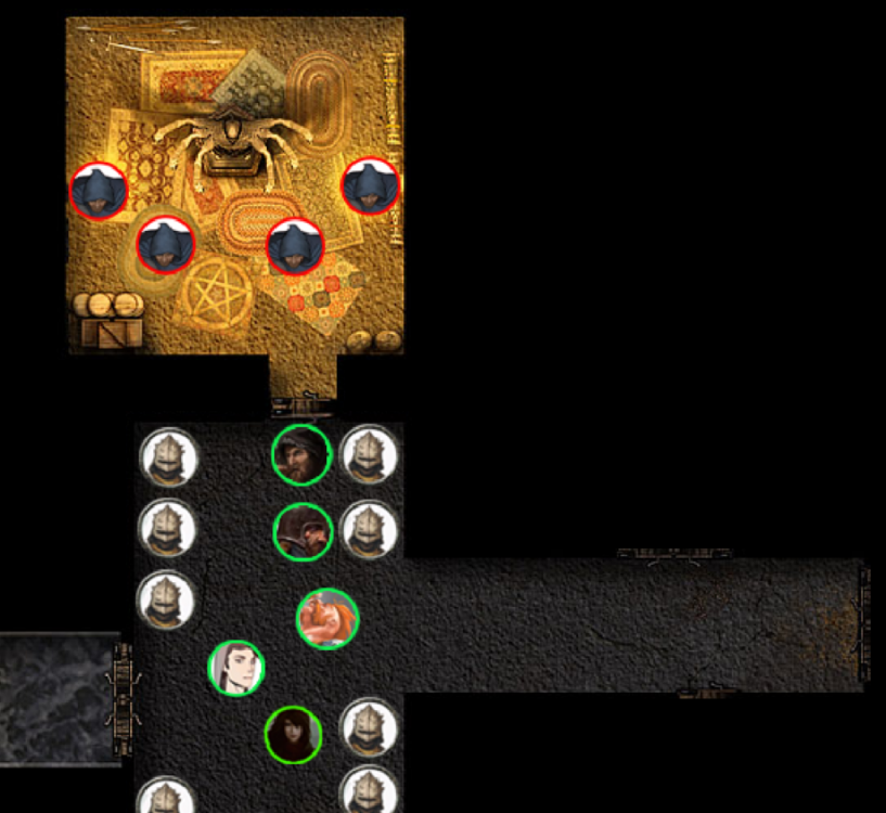 DM Lunedì 18 novembre 764 - notte, giorno? Avete perso la concezione del tempo [Miniera] Ed sbircia dentro la prima porta che trova, la prima a sinistra partendo dall'entrata.. nessun meccanismo nè trappola. Apre di quel tanto da poter riuscire ad allungare l'occhio e vedere.. ..una camera rettangolare con svariati tappeti sul pavimento, posizionati intorno ad un piedistallo di legno con al di sopra una statua che rappresenta un umanoide a 6 braccia. Ai bordi ci sono delle rastrelliere di armi, non particolarmente belle nè esotiche.. armi da quattro soldi insomma. Seduti in adorazione e (sembra) in preghiera ci sono 4 uomini incappucciati.. non hanno sentito nulla pare. Su due lati ci sono delle torce perenni che illuminano tutto il quadrato.