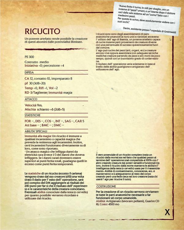 (non so se sono nella sezione giusta) Ciao a tutti, oltre al mio progettone grosso grosso sto cercando di progettare per una serata speciale una one-shot pathfinder dai risvolti un po inquietanti/horror/ecc. che ruota attorno ad un artefatto. La vicenda ruota appunto attorno all' ago di Baamia (farina del mio sacco eh) un potente artefatto capace di ricucire e ridare alla vita qualsiasi pezzo umanoide in stato di decomposizione lieve (quindi piuttosto fresco o ben mantenuto), le creature ri-assemblate a piacimento in questione si chiamano ricuciti intorno a questo oggetto io devo ricamare (che gioco di parole ahn?) tutta la storia. Il ricucito è sotto in allegato (l' illustrazione la sto per iniziare giuro)- ma ora sono come bloccato, non so da dove cominciare... IDEE: -Mi attirava l' idea che morto il "boss" la compagnia venisse a conoscenza che tutti gli abitanti del villaggio con cui loro avevo discusso chiaccherato ecc fossero dei ricuciti....o viceversa che dopo lo sterminio di tutti gli abitanti la compagnia capisse che in realtà erano semplici persone. -Il boss finale (colui che possiede ed utilizza l' ago) uccide sevizia e fa cose orribili con i cadaveri che poi utilizza per creare bestialità, tipo mischia corpi di bambini e animali, necrofilia...insomma una san dose di schifo ci sta. IDEE approvate da me stesso: Il cattivo l' ho sognato stanotte...e quindi direi che la parte del cattivo è sistemata. E' uno squilibrato mentale, ha perso i suoi figli in guerra e gli sono stati restituiti nelle bare che lui piangendo ha voluto aprire e ha visto i suoi due figli a pezzi letteralmente, da qui il suo cervello è andato completamente. La mattina dopo l' incidente una persona non ben definita bussa alla sua porta e sussurandogli due parole all' orecchio gli lascia in mano questo ago magico (quello per ricucire il collo a costanzo). Quest' uomo andrà poi nel cimitero dove sono i figli e li ricucirà insieme ridandogli la vita ma solo per pochi istanti dato che UDITE UDITE e qui fotto tutti i giocatori l' ago non funziona con persone con cui si hanno legami affettivi (appartiene pur sempre ad una divinità caotica malvagia eh). Il suo cervello da qui sbarella e lui comincia nel suo studio interrato a fare le peggio cose tentando di unire cani e bambini, si riscopre necrofilo ed omosessuale, pedofilo e zoofilo (giusto per non farci mancare niente) prova gusto nell' uccidere e gode con i cadaveri, dando vita a degli abominii mostruosi che si riversano poi nella città. Con il tempo la sua schizofrenia gli divide il cervello in due bipolarizzando il suo cervello tra un sadico dottore pazzoide, ad un"dottore" altrettanto schizofrenico ma con una ricerca ossessiva della perfezione nei corpi che crea (citazione vaga a dr. jekyll e mister hyde) alternando così esperimenti mostruosi ad esperimenti al limite della perfezione tra ricuciti e esseri umani veri. TIE' che dite? così in una botta sola ho messo una regola per l' ago, spiego perchè ci sono degli abomini in giro e perchè dei cadaveri perfetti e inoltre se voglio faccio venire la divinità dell' ago come vero boss ucciso il dottore (finto-boss). Scusate il messaggione, che ne pensate?? Urgono spunti!!! Grazie mille.