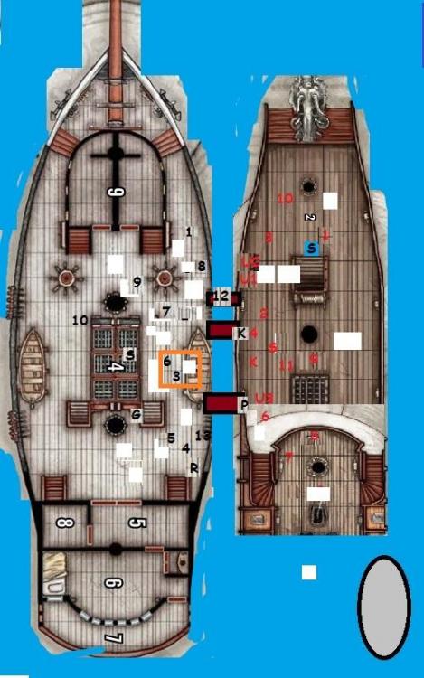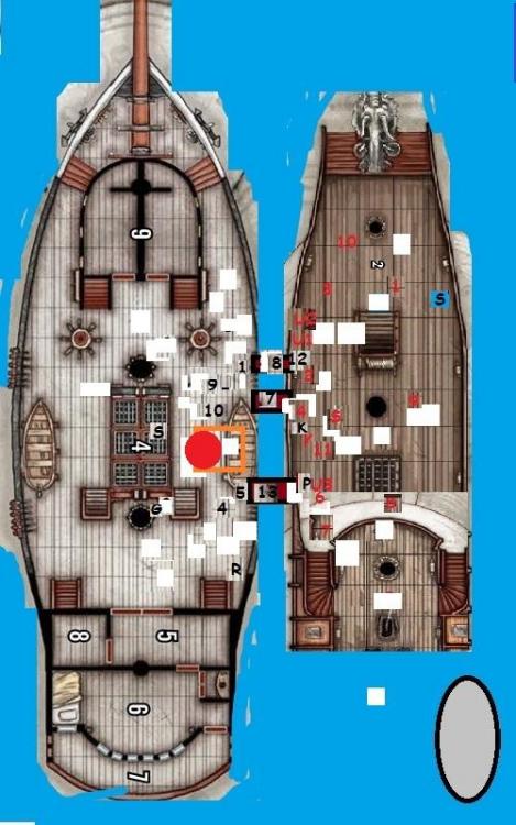 Kuruul dà il via alle danze attraversando rapidament ela passerella e affortnando l'avversario, che può ben poco sotto i colpi del piccolo e vecchio pirata finendo rapidamente in uan pozza di sangue. Il tentativo di Scabb ottiene solo di richiamare l'attenzioen su di sé del suo bersaglio, che sguaina la propria katana e si mette in difesa. Anche l'arma di Rosalee va subito a segno colpendo il tengu e ferendolo gravemente @Sedor Deglia vversari due umani (U1 e U2) con gesti rapidi si avvicinano alla vostra nave vicino alla passerella e lanciano delle affilate lame contro uno dei vostri che inizia a inondare di sangue il ponte della nave. Gli altri pirati avversari, al momento si limitano a mettersi sulla difensiva.