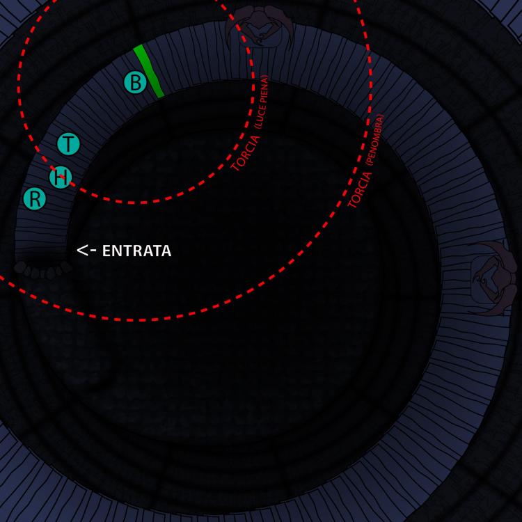 8. Tutti, interminabili attimi scandiscono una situazione sempre più surreale. La nebbiolina vi avvolge come un sudario funereo. La torcia ne risulta smorzata. La sua illuminazione si è ritirata in un globo ingabbiato, puntiforme e torbido (visibilità dimezzata. Vedi mappa). Ogni movimento è accompagnato da uno scalpiccio di frantumi. A qualche scalpiccio di frantumi sussegue un sonoro schianto dabbasso. Ed ogni schianto dabbasso è un allarme indicante un pezzo che si è staccato dal fondo della scala, indebolendola. Solo ora realizzate quanto quest’ultima possa cedere da un momento all’altro. (Se terminerete la giocata entro cinque gradini o meno l’uno dall’altro, sfidate il pericolo che le scale crollino nel vostro punto… eccetto per chi sta vicino a Robard (che da fiction “pesa come uno scricciolo”). Dal canto suo se Robard si trasforma in qualcosa di più pesante di un uomo medio, corre lo stesso rischio anche rimanendo da solo. Per darvi un’idea, in tutti questi casi la possibilità di un crollo è… diciamo di 1 su 4. Eventualmente tirerò a parte). Tivah e Bob, riguardo la presenza di trappole, vi state muovendo in un’area non ancora controllata. Inoltre le scale crepitano indolenti al minimo oscillare dei vostri pesi. Conviene muoversi oppure no? Nel porre attenzione al come respirare e sul dove mettere i piedi, la coda dell’occhio cattura qualcosa di anomalo… Ma come? Un attimo fa era proprio lì. La seconda gargolla, quella più lontana, sul lato est, sembra sparita da un momento all’altro. Non che sia illuminata ma… sembrava che… ah no. È ancora al suo posto… Forse. L’illuminazione è ormai ridotta al lumicino e il fluttuare della nebbiolina gioca brutti scherzi. O sono forse i vostri nervi a giocarveli?... Hallek e Robard, dalla vostra posizione vedete distintamente, più in su sulla scala, gli altri due compagni d'avventura. In particolare Bob, che regge una torcia miracolosamente rimasta accesa. Se la sono cavata nonostante, così imbiancati e logori, sembrano ritornati dall’oltretomba. Voi invece non riuscite a scorgere alcunché oltre un paio di braccia. Nulla eccetto un’ombra fugace, seguita da un leggerissimo spostamento d’aria. E' inquietante... ma è successo davvero… o sono i vostri nervi a farvi brutti scherzi?... Cosa fate? - In verde l’ultimo scalino controllato. Quelli precedenti sono tutti sicuri. - In arancio lo scalino dove è scattata accidentalmente la trappola della lama.