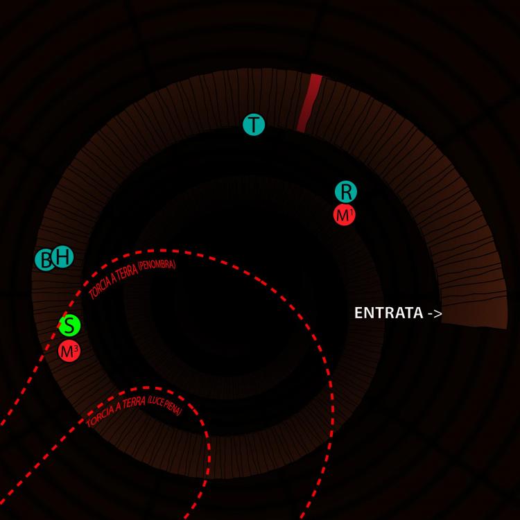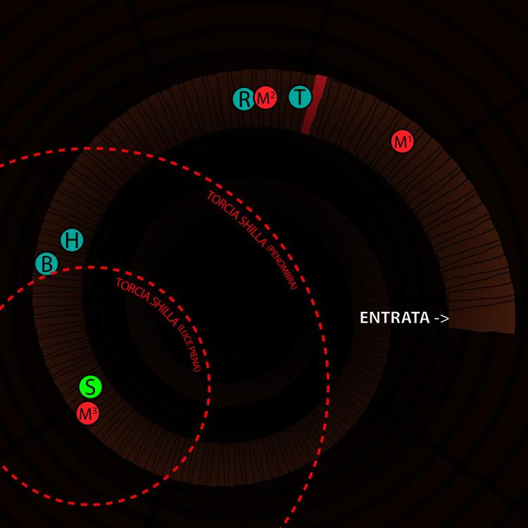 Tivah, ora che sei completamente al buio, ti tocca procedere a tentoni. Il limitare tra le scale e il baratro è pressoché invisibile. Non vorrai fare un passo falso… soprattutto mentre trascini un peso morto. Provi a sbarazzartene in fretta, la sua puzza farebbe vomitare una capra, ma mentre lo fai ti sembra che qualcosa si stia attorcigliando alla tua caviglia. È qualcosa di flessuoso, simile ad un tentacolo. Sai solo che mentre il cadavere precipita, senti uno strattone che rischia di trascinarti con lui… Non ci riesce fortunatamente. In un attimo ti ritrovi a cavalcioni sul ciglio, il cuore a mille. Qualsiasi cosa fosse ormai è andata giù. Molti secondi dopo senti riecheggiare uno “splash” dabbasso, in lontananza. Forse la struttura non ha solo l’apparenza di un enorme pozzo. Lì sotto c’è davvero del liquido. Ti senti orfana della tua arma, in bilico tra solido e vuoto, entrambi neri come inchiostro, lambita da tenebre che non sono normali tenebre…