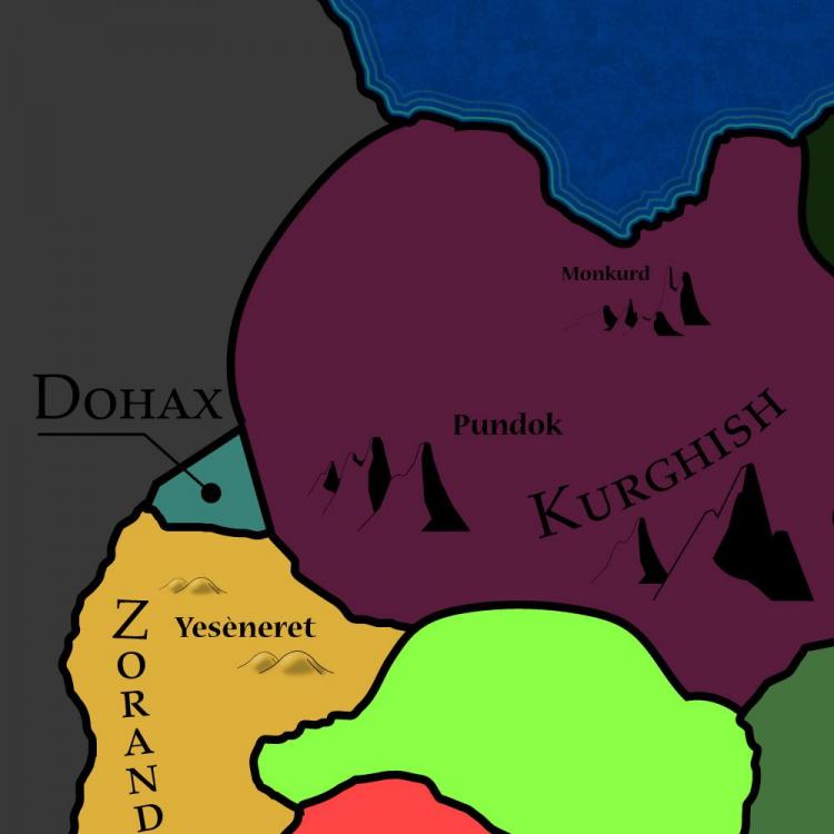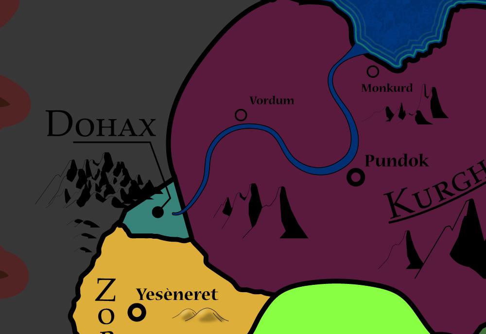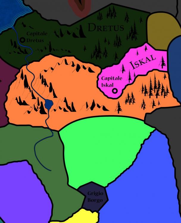 Prego. Il ruolo di cartografo mi è sempre piaciuto 🙂 Due cose: - Non mi era chiaro se il fiume partisse dal territorio di Clovis, o se lo attrversasse soltanto. Al limite posso allungarlo, facendolo arrivare dalle montagne a ovest. - Riguardo le etichette di Prosperità, avevo assegnato alle capitali Yesèneret e Pundok i valori di default, ossia "moderata". Ma essendo delle capitali potrebbero avere una Prosperità più alta. Considera comunque l'impatto del mancato commercio tra i due regni.