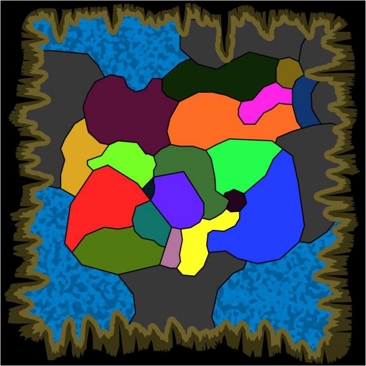 Ho abbozzato una cosa al volo. Chiedo venia se è un po' grezza ma, ripeto, è giusto per avere un quadro. I territori grigi (quindi da nord, sud, est, ovest) dovrebbero essere quelli da cui proviene la minaccia. I territori colorati sono i regni continentali, prima in guerra tra loro, adesso in tregua. La parte azzurrina maculata è il mare, ovviamente. Ho cercato di creare un bel po' di aree, ognuna col suo colore, in modo che mi possiate indicare più facilmente quella di vostro interesse. L'idea sarebbe che il GM e/o ognuno che abbia menzionato dei luoghi, mi dicesse dove si trovano. Se la scena si sposterà su una zona specifica, come ad esempio Grigio Borgo, zoommerò per l'occasione, eventualmente aggiungendo dettagli. Tanto il file è in vettoriale e non sgranerà. ... La mia idea (ma di questo me ne occuperò io, non vi preoccupate) sarebbe di arricchire i luoghi con le etichette del caso. Vedi capitolo "Il Mondo". Le etichette eventualmente si aggiorneranno. Per cui, oltre a dirmi dove sono collocati i luoghi, sarebbe gradito se mi deste qualche info su: - Prosperità del luogo - Andamento della popolazione (Esodo, in Diminuzione, Stabile, in Crescita, etc.), - Difese Esempio, in base a quanto è stato detto: GRIGIO BORGO - Prosperità: Moderata Qualunque oggetto ordinario si trova in vendita. Si possono trovare i più importanti tipi di manodopera specializzata, ma la domanda per il loro lavoro è alta. - Popolazione: Stabile La popolazione è in linea con le dimensioni correnti dell’insediamento. C’è una crescita lenta. - Difese: Sorveglianti Ci sono alcuni sorveglianti che stanno di guardia per individuare eventuali minacce e risolvono le piccole contese, ma il loro compito principale è di convocare la milizia. Etichette opzionali: - Sicuro: Sì I problemi esterni non arrivano fino a qui a meno che non ce li portino i giocatori. È idilliaco e probabilmente nascosto. Se l’insediamento perde o diminuisce un’etichetta benefica rimuovi sicuro al suo posto. - Religione: Sì (nome divinità da scegliere) La divinità indicata è venerata qui. - Esotico: Pietra Grigia Ci sono beni e servizi disponibili che non sono disponibili in nessun altro luogo vicino. Elencali. - Risorsa: Ferro, Argento L’insediamento ha facile accesso alla risorsa elencata (ad esempio una spezia, un minerale, pesce o uva). Tale risorsa è sensibilmente più economica. - Scarsità: (forse) Generi alimentari L’insediamento ha un forte o prolungato bisogno della risorsa indicata. Tale risorsa è sensibilmente più costosa. - Giuramento: Neutralità con tutti L’insediamento ha fatto un giuramento agli insediamenti indicati. Questi giuramenti sono generalmente di fedeltà o appoggio, ma possono essere più specifici. - Commercio: Per ora con nessuno L’insediamento commercia regolarmente con gli insediamenti indicati. - Mercato: Nessuno Tutti vengono qui per commerciare. Gli oggetti reperibili potrebbero, nei giorni di mercato, essere più reperibili di ciò che è normale per il livello di prosperità. Prendi +1 a fare rifornimento. - Ostilità: Nessuna L’insediamento porta rancore verso gli insediamenti indicati. - Storico: Niente per ora Qualcosa di importante è successo qui, scegli un’opzione e aggiungi dettagli o inventatela tu: battaglia, miracolo, mito, storia d’amore, tragedia. - Arcano: Niente per ora Qualcuno in città può lanciare incantesimi arcani a pagamento. Ciò tende ad attirare altri incantatori. +1 a reclutare quando spargi la voce che stai cercando un adepto. - Divino: Fontana mistica C’è una forte presenza religiosa, forse una cattedrale o un monastero. Possono guarire e forse anche resuscitare i morti in cambio di una donazione o del compimento di una missione. Prendi +1 per reclutare sacerdoti qui. - Gilda: Niente per ora. La gilda indicata ha una presenza importante qui (e solitamente una considerevole influenza). Se la gilda è strettamente associata a un tipo di gregario, prendi +1 per reclutare quel tipo di gregario. - Personalità: Per ora nessuno C’è una persona degna di nota che abita qui. Dagli un nome e spiega perché è degna di nota. - Nanico: Per ora no L’insediamento è composto principalmente o completamente da nani. I prodotti nanici sono più diffusi e meno costosi del solito. - Elfico: Per ora no L’insediamento è composto principalmente o completamente da elfi. I prodotti elfici sono più diffusi e meno costosi del solito. - Artigianato: Scultura L’insediamento è noto per la sue eccellenza nell’arte indicata. I prodotti di artigianato di quel tipo sono più facilmente reperibili o di qualità più alta qui che altrove. - Anarchico: Direi di no Il crimine dilaga, le autorità sono deboli. - Flagello: No L’insediamento ha un problema ricorrente, di solito un tipo di mostro. - Potere: Mantenere la pace L’insediamento ha un’influenza di qualche tipo. Solitamente politica, divina o arcana. Opzioni utilizzate per creare un borgo: - Il borgo è concentrato su un mestiere: Artigianato (a tua scelta), Risorsa (qualcosa di necessario per quel mestiere) - Il borgo ha monopolizzato il commercio di un bene o un servizio: Esotico (il bene o il servizio), Ostilità (un insediamento ambizioso)