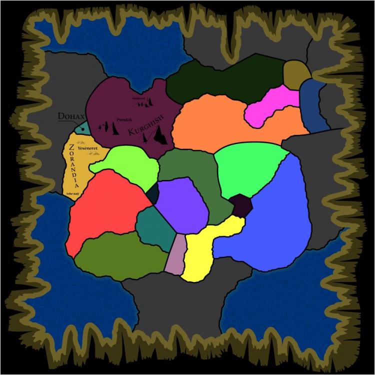 La parte esterna, nera/grigio scura, sarebbero dei territori nemici che spingono contro i confini del continente. Ho formato una “Grande Steppa” tra la regione giallo-oro a nord-est (adesso Lerolfa), e quella a forma di C (adesso Kaiimen), ed estendendola nel territorio rosa (nord di Iskal) e in quello arancio (Iskal). Potenzialmente ci sono 4 territori con i quali le tribù potrebbero commerciare. Come punti di riferimento ho sparpagliato nella Grande Steppa città e villaggi con nomi a caso. Le tribù più stanziali potrebbero trovarsi in essi o nei loro pressi. Quelle nomadi potrebbero spostarsi stagionalmente, chessò, dai pressi di Zollabrulla a Geret.