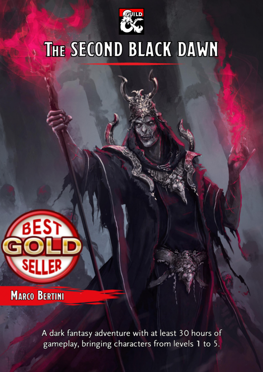 La Seconda Alba Nera in lingua inglese ha raggiunto il traguardo "Best Gold Seller"! Se per Halloween non sai ancora cosa giocare, quest'avventura piena di adrenalina, non morti e sfide è in sconto del 25% fino al 31 Ottobre in lingua italiana: https://www.dmsguild.com/product/261353/La-Seconda-Alba-Nera?src=hottest_filtered&filters=0_0_0_0_0_0_0_45480
