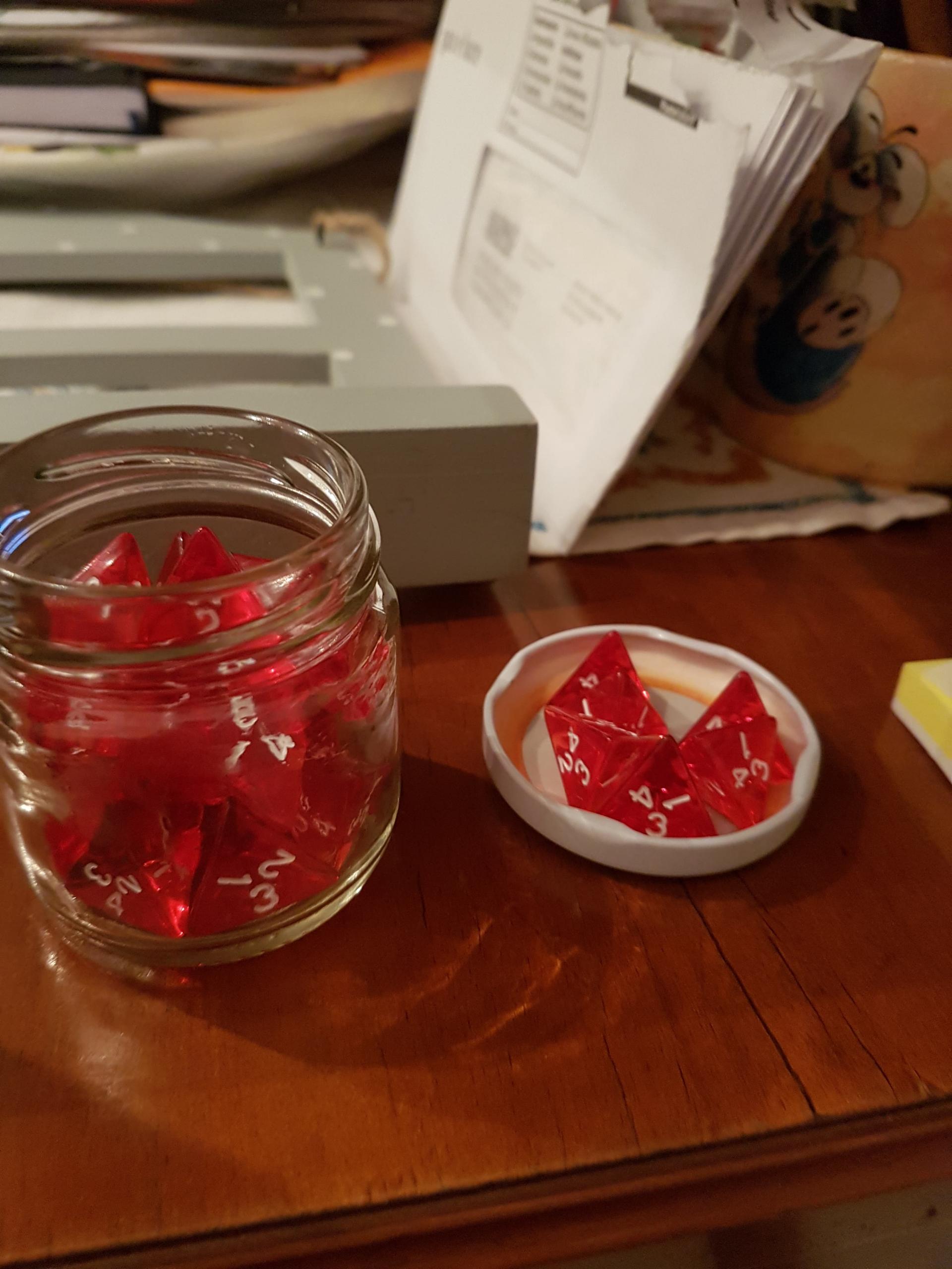 Ciao, come da titolo vendo manuale dei mostri Italiano nuovo, ma con un piccolo difetto di stampa (c'è un topo che copre parzialmente delle statistiche del mulo, come riportato in foto), per il resto il libro è in ottime condizioni (foto). Vendo a metà prezzo, 25€, più spese di spedizione a carico dell'acquirente (2 euro piego libri normale, 5 euro piego di libri raccomandato). Inoltre vendo 30 dadi da 4 facce rossi nuovi (utili per le pozioni e i dardi incantati, li vendo perché ne ho acquistati troppi). Li vendo per 10 euro, più spese di spedizione con corriere (circa 5 euro). Allego foto per entrambi.