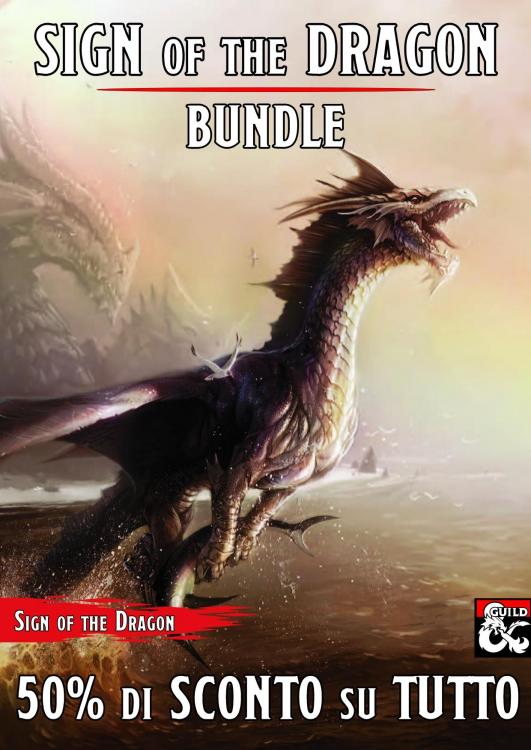 Per un periodo di tempo limitato, sarà disponibile il bundle di tutti i contenuti di "Sign of the Dragon", al prezzo scontato del 50%! Lo trovate qui: https://www.dmsguild.com/product/298713/Sign-of-the-Dragon--BUNDLE?src=newest_community&filters=0_0_0_0_0_0_0_45480