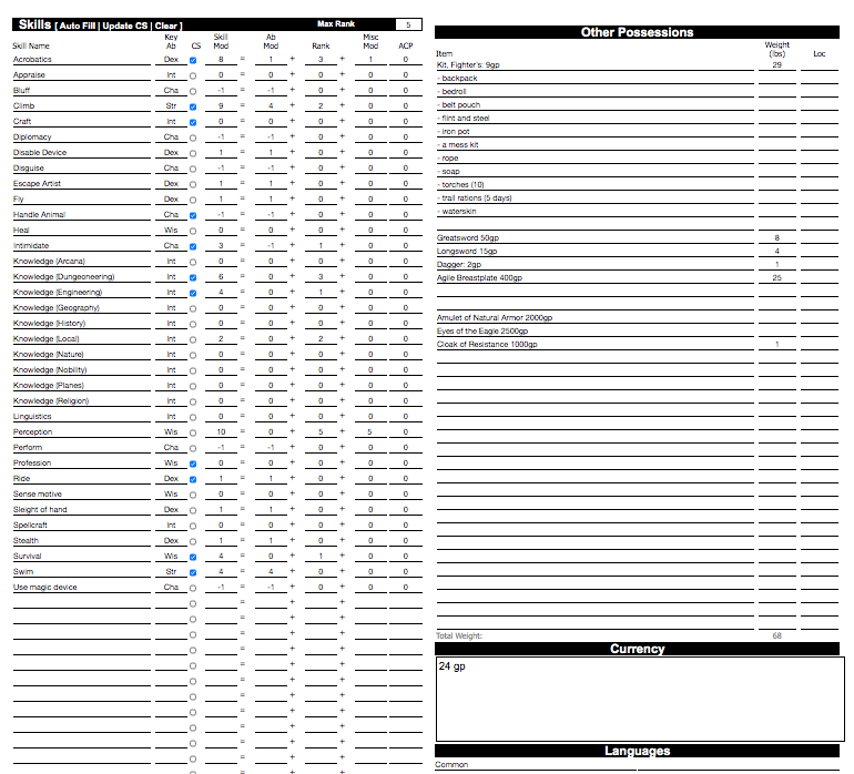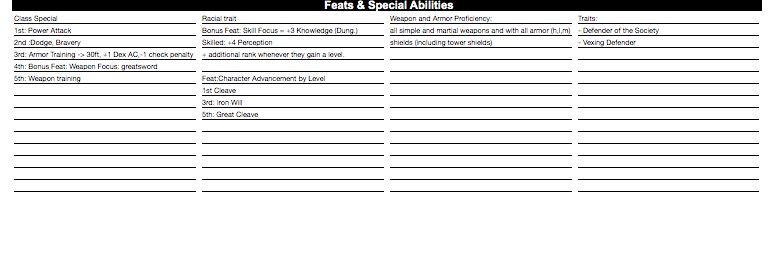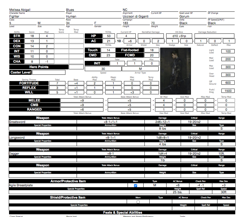 Eccomi qua. Situazione di partenza, qui sotto. Dopo l'aggiornamento, classe preferita hp. Sono un fighter, quindi hit die 10. Skill rank= 2 + INT mod, quindi resto a due. Cambiato BAB, messa la nuova feat. HP, non so se siano corretti, ho aggiunto solo 10 rispetto a prima. Va bene così compilata? Grazie.