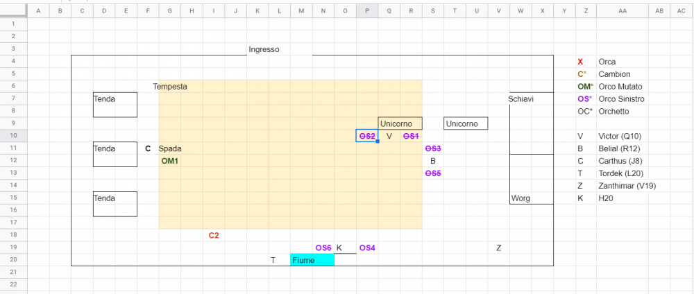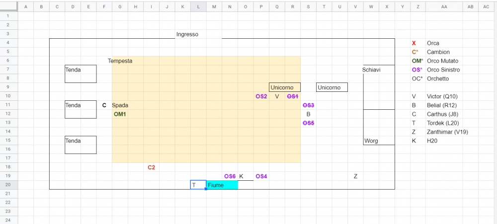 ho rivisto la posizione del chierico. l'orco non si muove di 9mt ma può fare doppio movimento e fare azione di attacco. puoi fare un AdO su OS6, hai pure fatto Critico con la lancia, oppure vuoi usare un trucchetto se hai war caster. fammi sapere. con la lancia hai fatto 23 danni. se vuoi usare un trucchetto dimmi pure, così aggiorno i danni. in spoiler ho messo la mappa come le altre volte, mi era sfuggita prima. @Alabaster OS2 muore, mi diresti la tua azione, ho postato anche le coordinate non l'ho capita dalla tua descrizione. Grazie! Postate tutti con tutti, a mio avviso lo scontro ha scavallato la parte "mortale" state entrando in controllo.