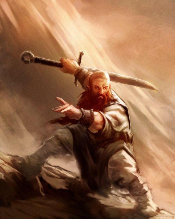 @Linden ho sistemato un po le idee e questo è quello che ne è venuto fuori. Seguirò il post di @Knefröd per presentare il pg che vorrei portare. Holfang Spadalunga, del clan Fossospaccato - Monaco Kensei Artigiano del Clan. Nato da una famiglia di artigiani e armaioli, Hulfang vive una gioventù serena e parte appena raggiunta la maggiore età per la superficie, alla ricerca dei segreti che le migliori armi nascondono. Durante i suoi viaggi all'esterno apprende l'arte della spada, carpendone i più intrinsechi segreti e studiandone la sua filosofia. Tornato in patria si ricongiunge alla sua famiglia, poco prima della morte del padre. Il suo stile di vita, la sua abilità con la spada e la sua agilità gli conferiranno un soprannome particolare tra la sua gente. Per onorare il padre diventa l'artigiano del clan Fossospaccato, specializzandosi non solo sui lavori più duri come la forgiatura ma anche su lavori più tecnici e artistici, come la realizzazione di mappe o di testi scritti. Ama il suo lavoro e si sente bene tra i Fossospaccato. Viene a scoprire che un suo caro amico (lascio pochi dettagli per ora) è uno dei sei nani scomparsi nell'ultima spedizione, perciò decide di candidarsi come membro esplorativo per il suo clan, garantendo un aiuto nel mantenimento delle armi, nella mappatura della nuova caverna e nel ritrovare il gruppo scomparso. Spera di essere di aiuto per il suo clan e spera anche di ritrovare il suo caro amico. È un individuo tranquillo, gentile e di poche parole. Sa quando parlare e quando agire e ha uno stile di combattimento molto particolare, volto più al movimento piuttosto che alla difesa. A differenza di molti altri nani, Hulfang combatte con una spada con lama piatta e larga e con un'impugnatura molto lunga (immagine), inoltre porta sempre con se un arco lungo. Piacerebbe anche a me creare qualche altro legame con gli altri personaggi, ho cercato di creare un pg molto legato al proprio clan, aggiungendo anche un movente sentimentale per la sua candidatura.